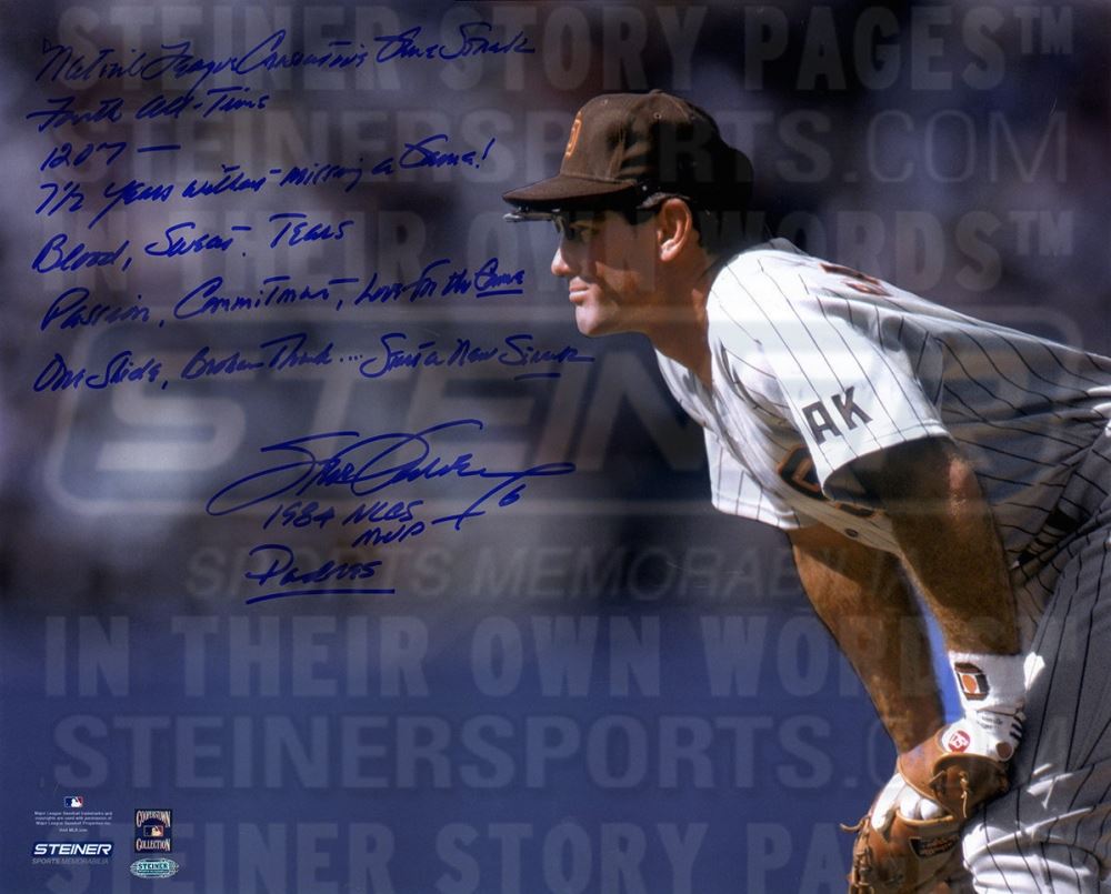 Photo measures 16" x 20" in size. Hand-signed and inscribed in blue felt-tip pen by Steve Garvey (Dodgers).