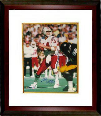 Grogan was selected in the fifth round in the 1975 NFL Draft by the New England Patriots. At the time of his retirement, Grogan lead the franchise as the all-time leader in passing yards (26,886) and passing touchdowns (182). Statistically, Grogan's best season was the Patriots 1979 season, when he completed 206 of 423 passes for 3,286 yards and 28 touchdowns, rushing for 368 yards and 2 touchdowns. His 28 touchdown passes led the league.Steve Grogan has hand autographed this New England Patriots 16x20 Photo. Sports Images Hologram and Certificate of Authenticity from Athlon Sports. Custom White Mat and Premium Mahogany Frame as shown.