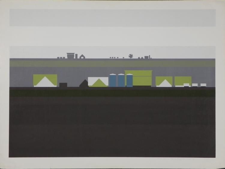 This is a modern style landscape portrait of the views one sees while driving down I-55 straight across rural Illinois. Artist: Steve Horan Signature: In pencil, lower right ("Horan")Title: "March Along I-55"Edition: Numbered 114/140Medium: Print on paperSheet size: 30 x 40 inches Date: 4/30/76Condition: Good; some image scuffs, and margin tearsBiography:Steve Horan studied Art History at the University of Chicago. Much of his artistic influence came from doing part time jobs, including card lettering, sign painting, and commercial layout. Working in acrylics or pastels, he captures basic geometric forms of landscapes, inspired by memories and discovering new ways of looking at things. Horan's art has appeared in many national exhibitions and one-man shows, as well as galleries in New York, Chicago and cities around the country.