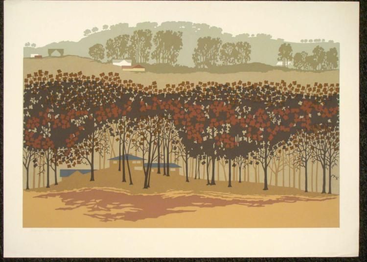 A south suburban area of Chicago is portrayed in the print, with hills and lush autumn trees nestling the houses. * Artist: Steve Horan Signature: In pencil, lower left ("Horan")Title: "Homewood"Edition: Artist Proof, marked H/C, lower leftMedium: Serigraph on paperSheet size: 26 x 36 inches Condition: Very good; scuff marks overall, and some edge creasing Biography: * Steve Horan studied Art History at the University of Chicago. Much of his artistic influence came from doing part time jobs, including card lettering, sign painting, and commercial layout. Working in acrylics or pastels, he captures basic geometric forms of landscapes, inspired by memories and discovering new ways of looking at things. Horan's art has appeared in many national exhibitions and one-man shows, as well as galleries in New York, Chicago and cities around the country. *