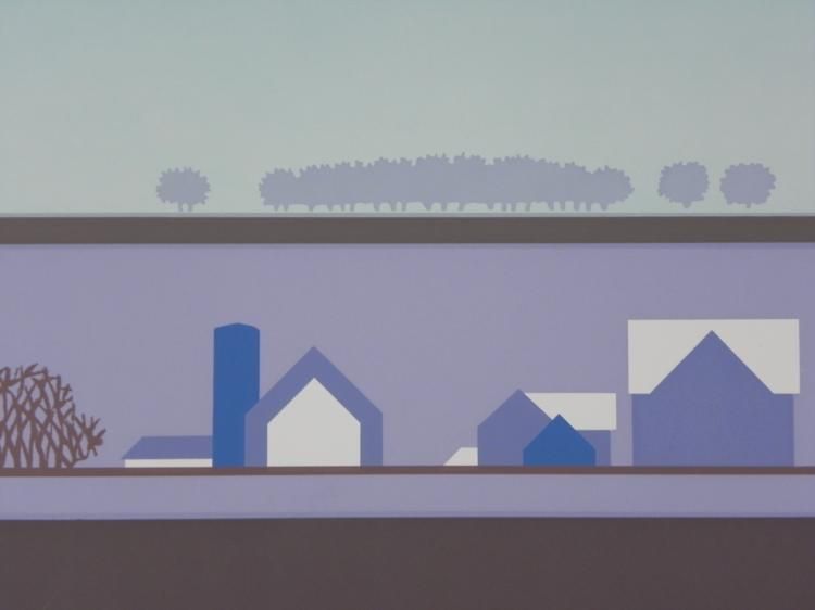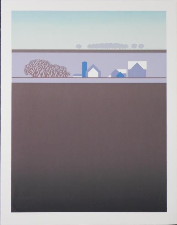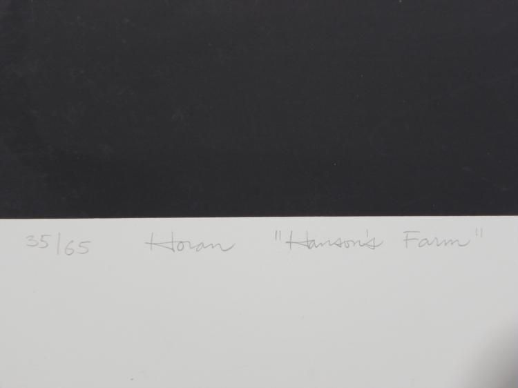 Here is a modern work portraying a farm in the Midwest, with the space in the foreground emphasizing the wide, flat spaces of the rural areas. Artist: Steve Horan Signature: In pencil, lower left ("Horan")Title: "Hanson's Farm"Edition: Numbered 35/65Medium: Print on paperSheet size: 22 x 28 inches Condition: Very good; minor scuffsBiography:Steve Horan studied Art History at the University of Chicago. Much of his artistic influence came from doing part time jobs, including card lettering, sign painting, and commercial layout. Working in acrylics or pastels, he captures basic geometric forms of landscapes, inspired by memories and discovering new ways of looking at things. Horan's art has appeared in many national exhibitions and one-man shows, as well as galleries in New York, Chicago and cities around the country.