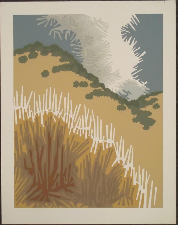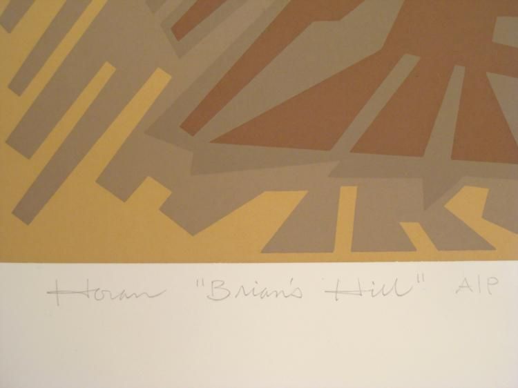 This modern print portrays a wooded hill with geometric forms and naturalistic colors. Artist: Steve Horan Signature: In pencil, lower left ("Horan")Title: "Brian's Hill"Edition: Artist's Proof, marked A/P lower leftMedium: Serigraph on paperSheet size: 22 x 28 inches Condition: Very good; minor scuff marks overall, and some edge creasing; half inch tear, upper right corner, easily matted over Biography:Steve Horan studied Art History at the University of Chicago. Much of his artistic influence came from doing part time jobs, including card lettering, sign painting, and commercial layout. Working in acrylics or pastels, he captures basic geometric forms of landscapes, inspired by memories and discovering new ways of looking at things. Horan's art has appeared in many national exhibitions and one-man shows, as well as galleries in New York, Chicago and cities around the country.