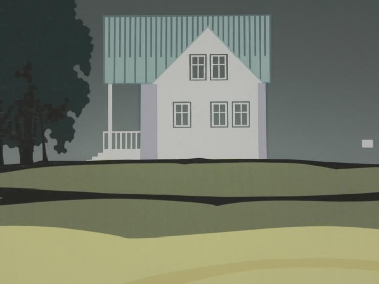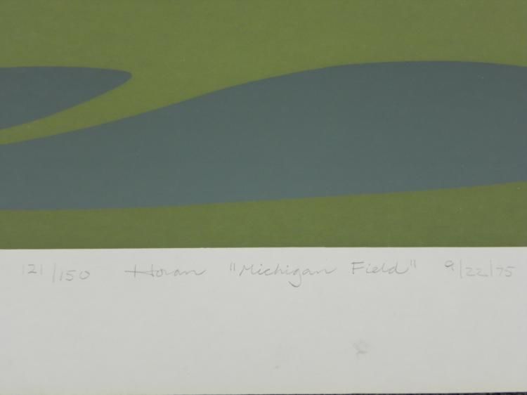 Here is an art print portraying homes around a field in rural Michigan, done with clean and geometric forms. Artist: Steve Horan Signature: In pencil, lower right ("Horan")Title: "Michigan Field"Edition: Numbered 121/150Date: 9/22/75Medium: Print on board