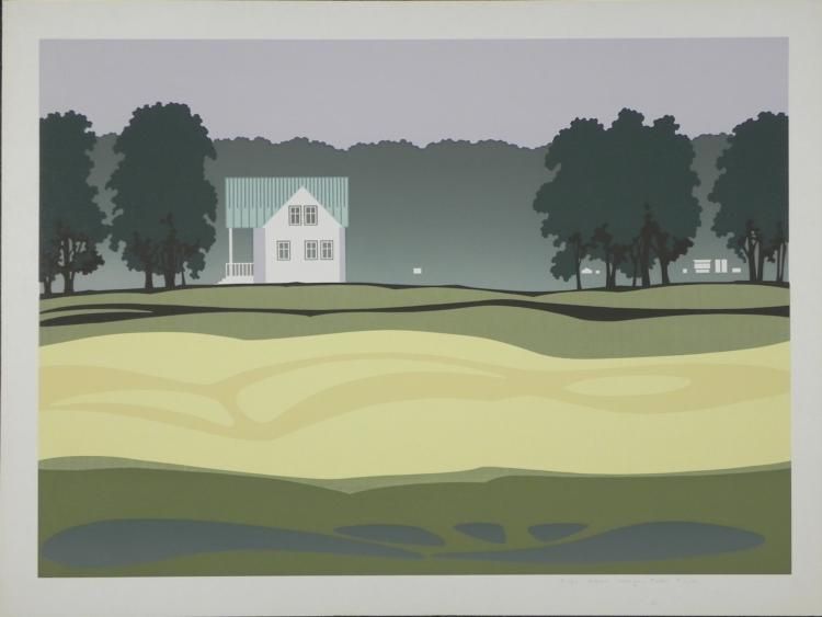 Here is an art print portraying homes around a field in rural Michigan, done with clean and geometric forms. Artist: Steve Horan Signature: In pencil, lower right ("Horan")Title: "Michigan Field"Edition: Numbered 121/150Date: 9/22/75Medium: Print on boardSheet size: 30 x 40 inches Condition: Very good; minor scuffsBiography:Steve Horan studied Art History at the University of Chicago. Much of his artistic influence came from doing part time jobs, including card lettering, sign painting, and commercial layout. Working in acrylics or pastels, he captures basic geometric forms of landscapes, inspired by memories and discovering new ways of looking at things. Horan's art has appeared in many national exhibitions and one-man shows, as well as galleries in New York, Chicago and cities around the country.