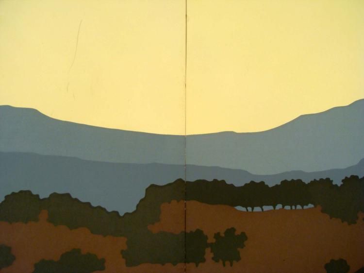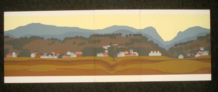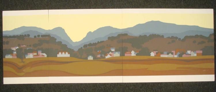 The interesting thing about this triptych is that it can be fit together in multiple ways. This modern print depicts a mountain village, and the landscape can be altered by switching the order of the sheets. Artist: Steve Horan Signature: In pencil, lower