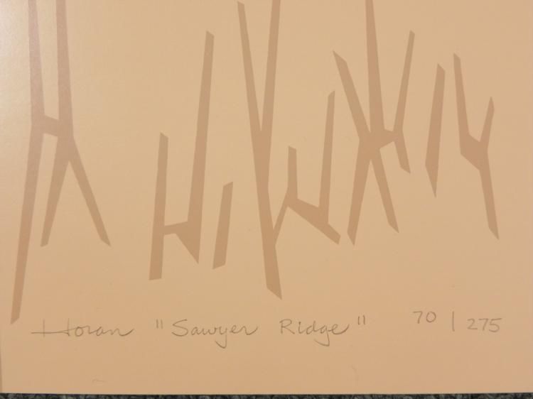 This triptych portrays the expansive nature of a rolling landscape dotted with small houses. Artist: Steve Horan Signature: In pencil, on the center panel lower left ("Horan")Title: "Sawer Ridge"Edition: Numbered 70/275Medium: Print on paperSheet sizes: 20 x 28 and 28 x 28 inches Condition: Very good; minor scuffsBiography:Steve Horan studied Art History at the University of Chicago. Much of his artistic influence came from doing part time jobs, including card lettering, sign painting, and commercial layout. Working in acrylics or pastels, he captures basic geometric forms of landscapes, inspired by memories and discovering new ways of looking at things. Horan's art has appeared in many national exhibitions and one-man shows, as well as galleries in New York, Chicago and cities around the country.