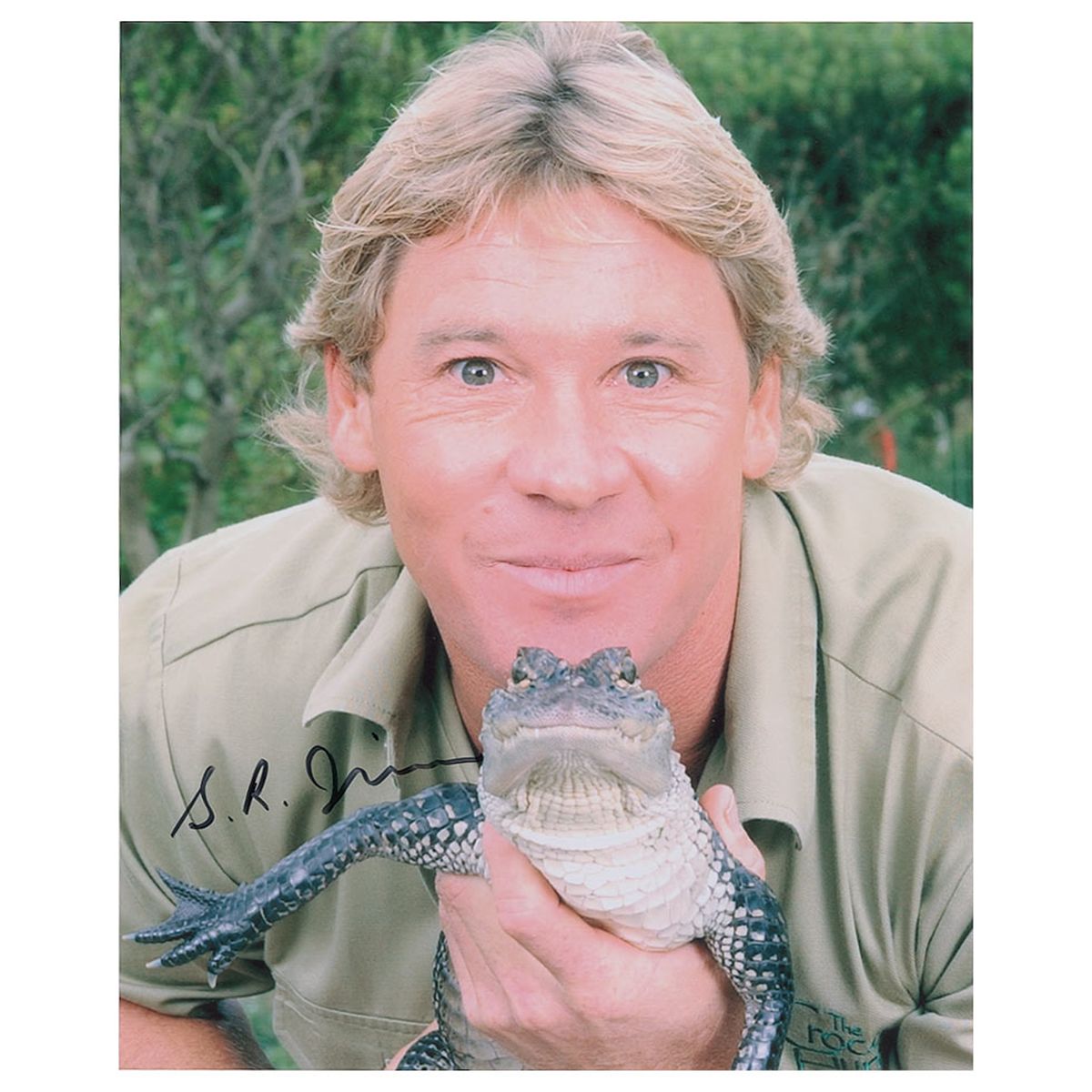 Color glossy 8 x 10 photo of Irwin cuddling with a small crocodile, signed in black felt tip, “S. R. Irwin.” In very fine condition.