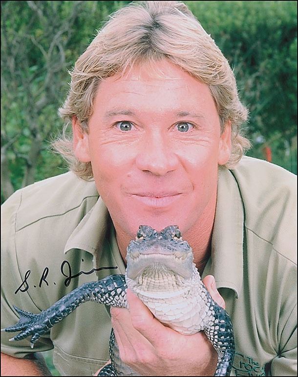 Color glossy 8 x 10 photo of Irwin holding up a baby crocodile, signed in black felt tip, "S. R. Irwin." In fine condition.