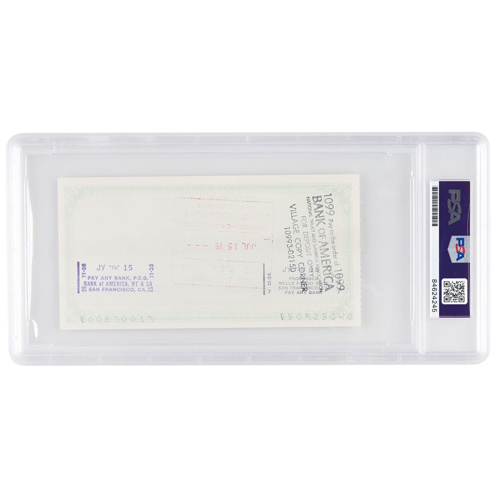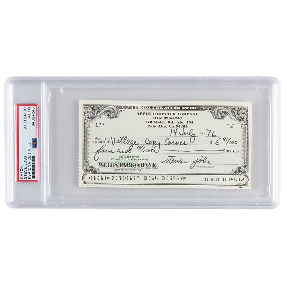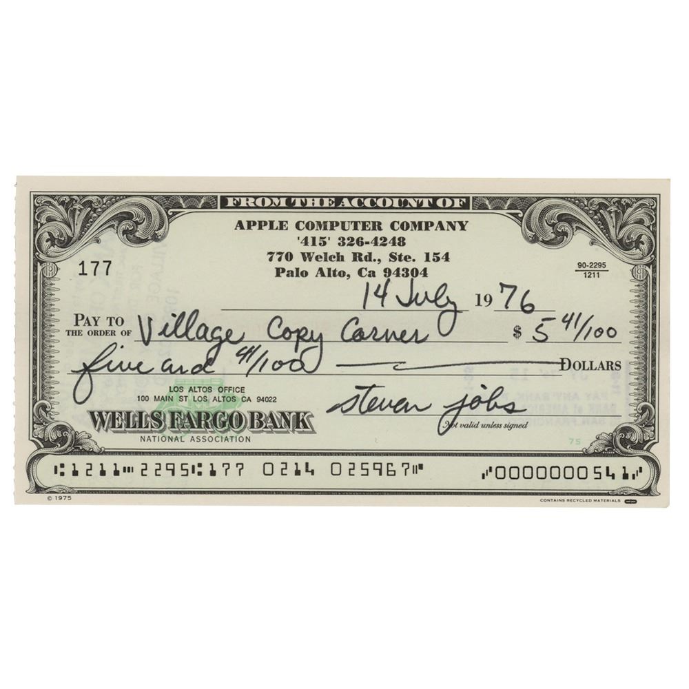 Extraordinary Apple Computer Company check, 6 x 3, filled out and signed by Jobs, "steven jobs," payable to Village Copy Corner for $5.41, July 14, 1976. Headed "Apple Computer Company," the check uses Apple's first official address at "770 Welch Rd., Ste. 154, Palo Alto"—the location of an answering service and mail drop that they used while still operating out of the famous Jobs family garage. Village Copy Corner, located at 300 S. San Antonio Road, was just four miles down the road from the Jobs family home. In very fine condition. Encapsulated in a PSA/DNA authentication holder.