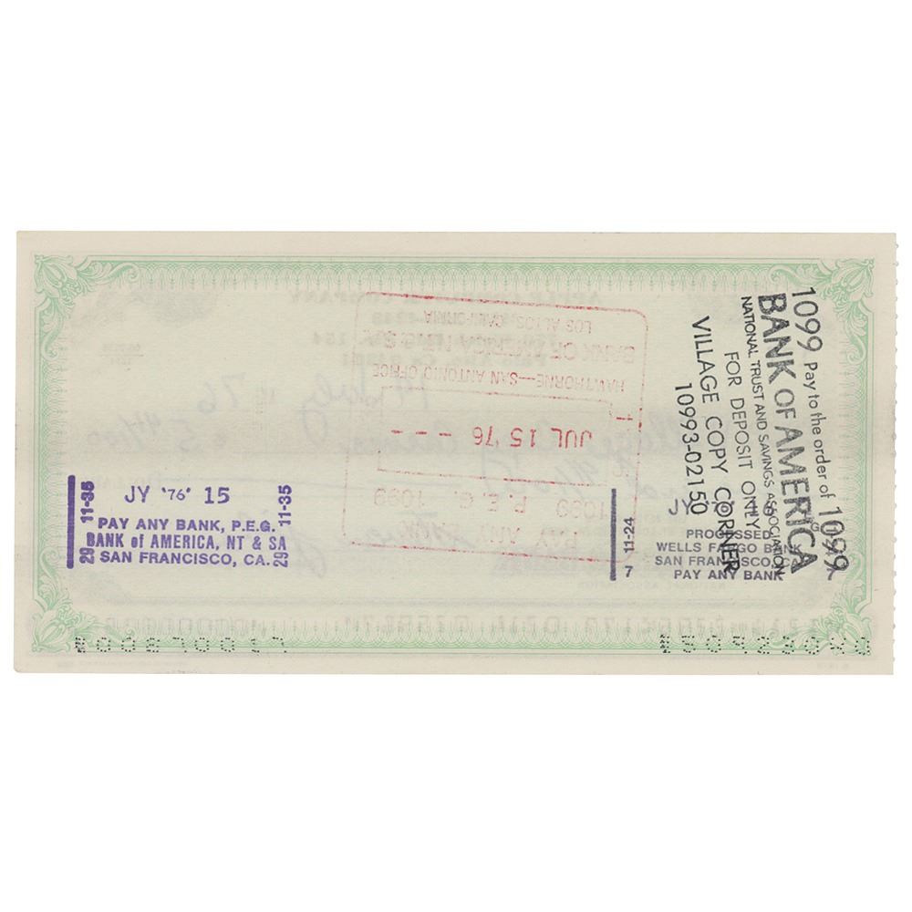 This exemplary Apple Computer check is the earliest of the three that we have offered—dated July 14, 1976, it was filled out and signed by Steve Jobs one day before he and Woz paid $3,430 to Kierulff Electronics for parts for the Apple-1. That check of July 15th, which we sold in March 2022, achieved over $160,000 at auction. The company had been founded just three months earlier, and they were hard at work building their first product.