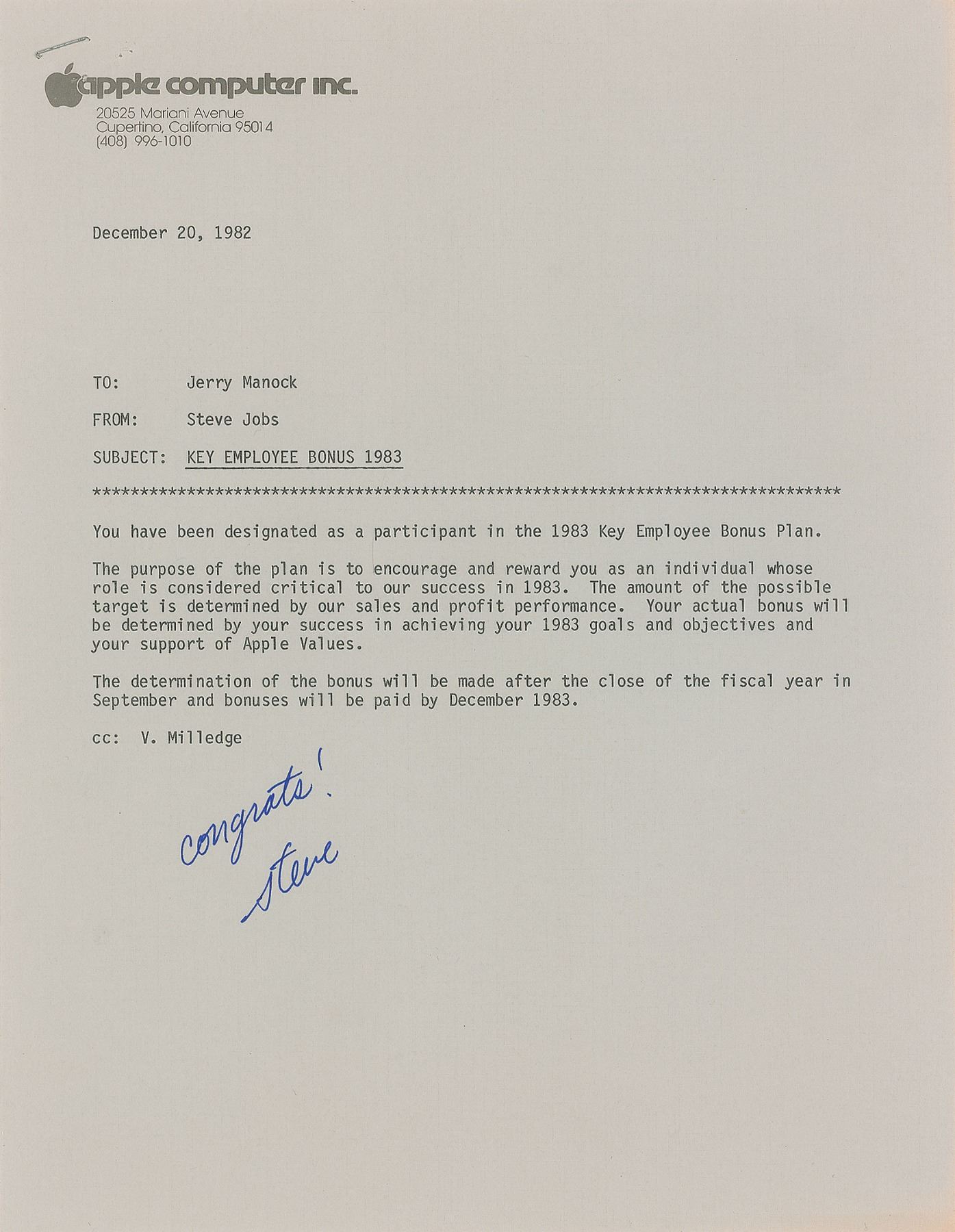 Internal memo signed "Congrats! steve," one page, 8.5? x 11?, Apple Computer, Inc., letterhead, December 20, 1982. Memo issued by Steve Jobs to Jerry Manock under the subject "KEY EMPLOYEE BONUS 1983," in full: "You have been designated as a participant in the 1983 Key Employee Bonus Plan. The purpose of the plan is to encourage and reward you as an individual whose role is considered critical to our success in 1983. The amount of the possible target is determined by our sales and profit performance. Your actual bonus will be determined by your success in achieving your 1983 goals and objectives and your support of Apple Values. The determination of the bonus will be made after the close of the fiscal year in September and bonuses will be paid by December 1983." Signed at the conclusion in blue ink by Jobs. In fine condition. Accompanied by full letters of authenticity from PSA/DNA and Beckett Authentication Services.