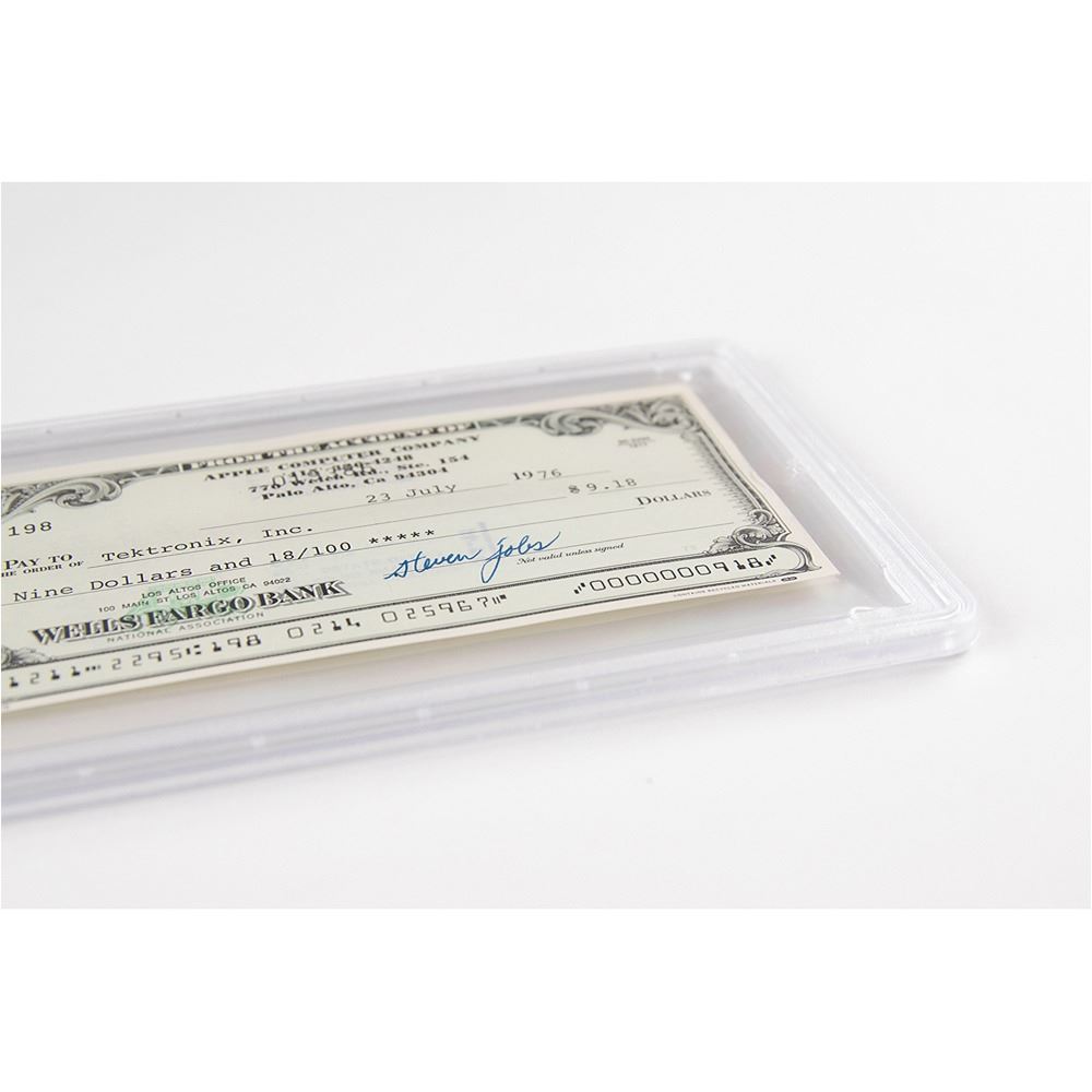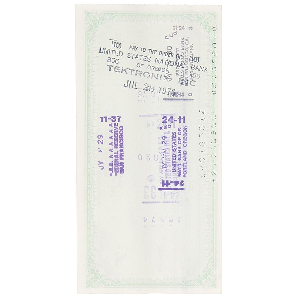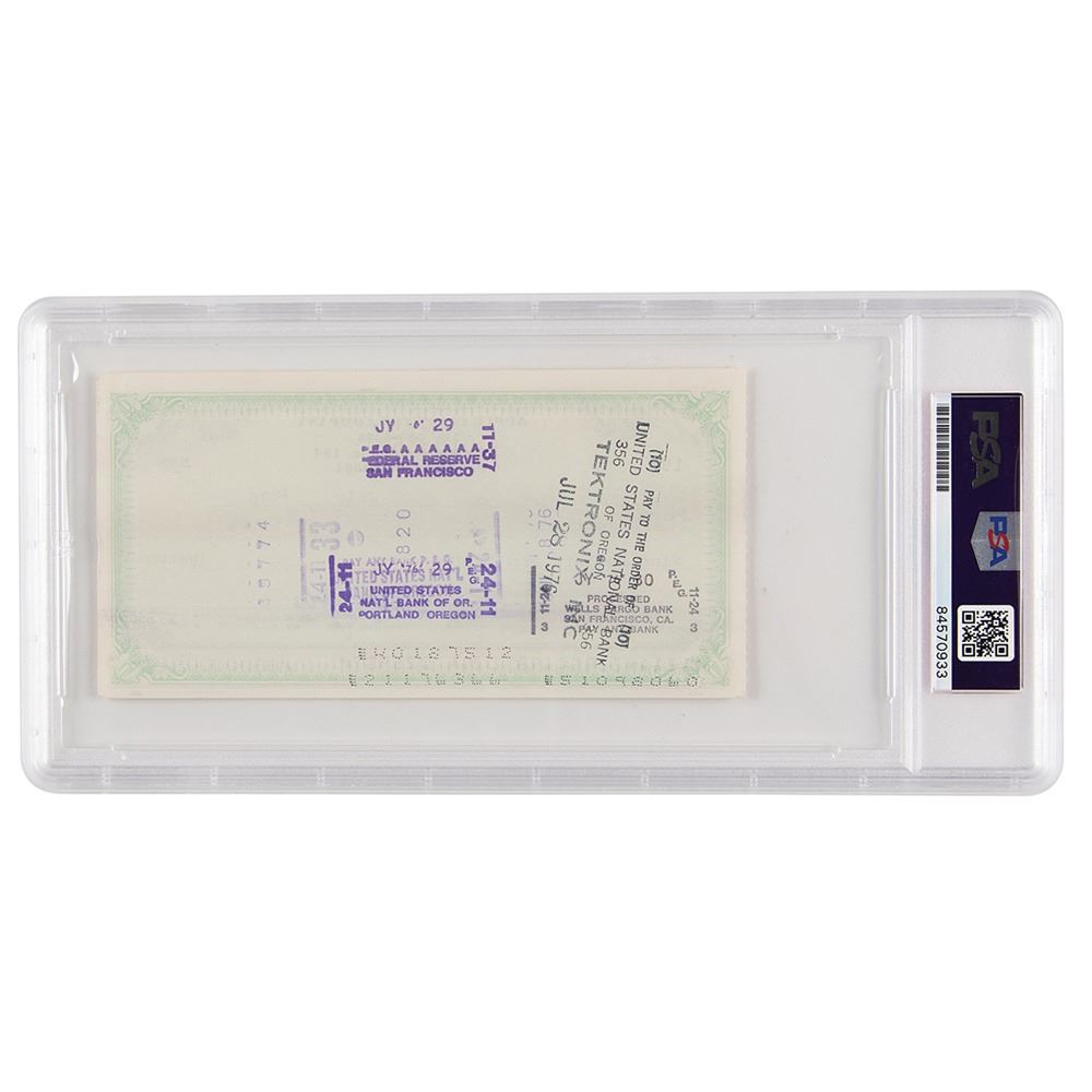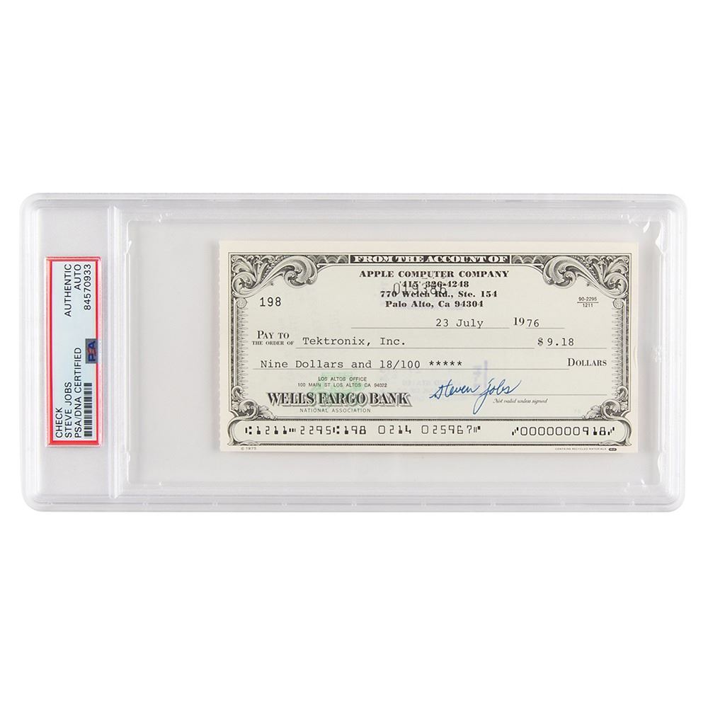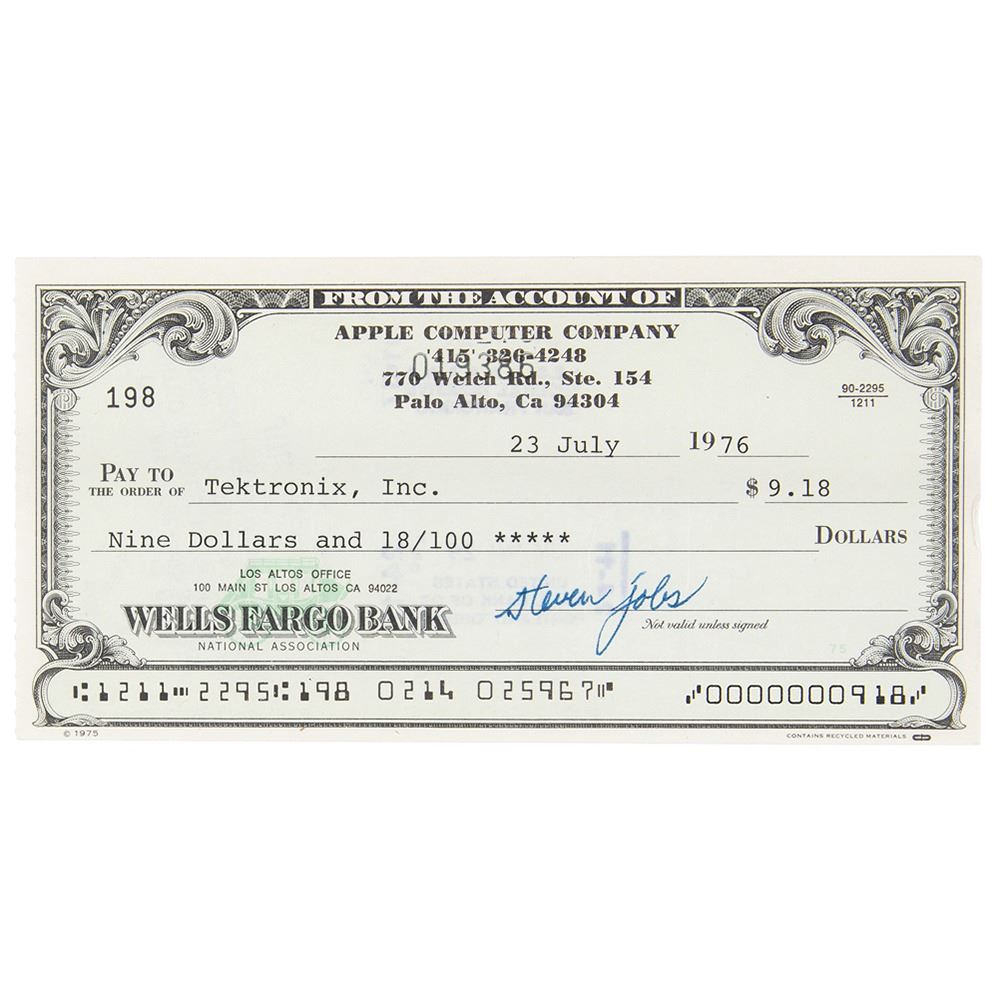 Exceptional Apple Computer Company check, 6 x 3, filled out in type and signed by Jobs, "Steven Jobs," payable to Tektronix, Inc. for $9.18, July 23, 1976. Headed "Apple Computer Company," the check uses Apple's first official address at "770 Welch Rd., Ste. 154, Palo Alto"—the location of an answering service and mail drop that they used while still operating out of the famous Jobs family garage. In very fine condition. Encapsulated in a PSA/DNA authentication holder.