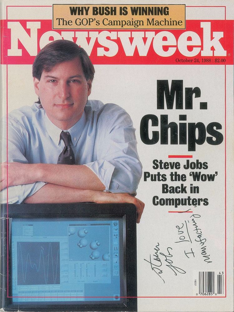 Amazing issue of Newsweek magazine from October 24, 1988, featuring Jobs and his NeXT computer on the front cover, 84 pages, 8 x 10.75, signed vertically on the front cover in black felt tip, "Steven Jobs, I love manufacturing." In fine condition, with small creases to spine. Accompanied by full letters of authenticity from PSA/DNA, Beckett Authentication Services, and JSA, and a detailed letter of provenance from the consignor, who had this signed in-person by Jobs in 1988. Her letter reads, in part: "In October 1988, Steve Jobs came to Lotus Development Corporation in Cambridge Ma to unveil the much anticipated NeXT computer. It was expected to revolutionize academia and all things educational. I was a senior buyer @ Lotus working in the manufacturing facility at the time and had somewhat of a school girls crush on Jobs' genius and entrepreneurial spirit. Realizing his visit to Lotus was a pivotal and exciting time in his career; I stopped at a hotel gift shop and purchased some mints along with several magazines that he was featured on…The grand ballroom at the Sonesta Hotel in Cambridge MA was jam packed with fellow 'Loti' with reporters, teleprompters and live feeds from all over the world. After an elaborate fan fare unveiling people were standing and clapping. Steve walked off stage, came down into the front row and plopped himself on a table next to me. I froze. I showed him a pile of magazines and asked him to pick one to autograph for me. He hesitated and said 'I don't do autographs' at which point I stepped closer, locked eyes and said 'then write something from your heart.' He smiled from ear to ear, picked the Newsweek and jotted the words: I love manufacturing and then signed it!"
