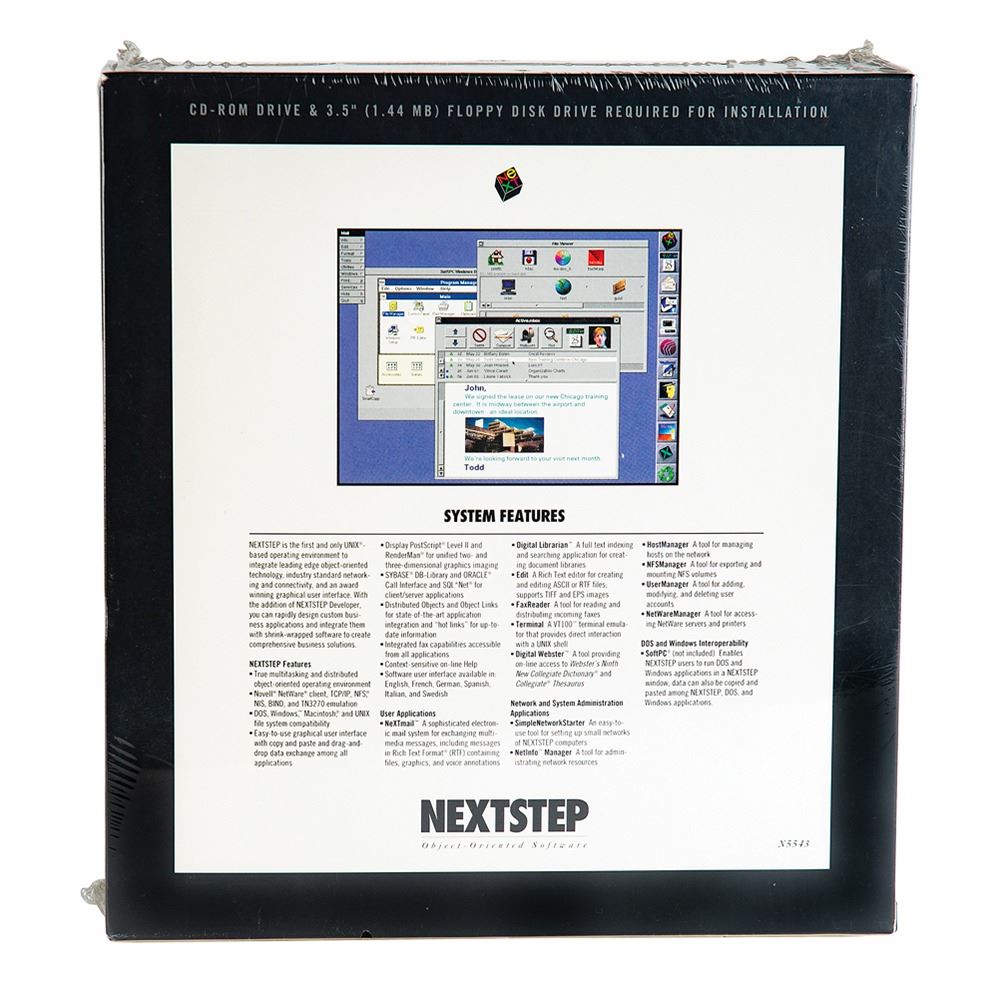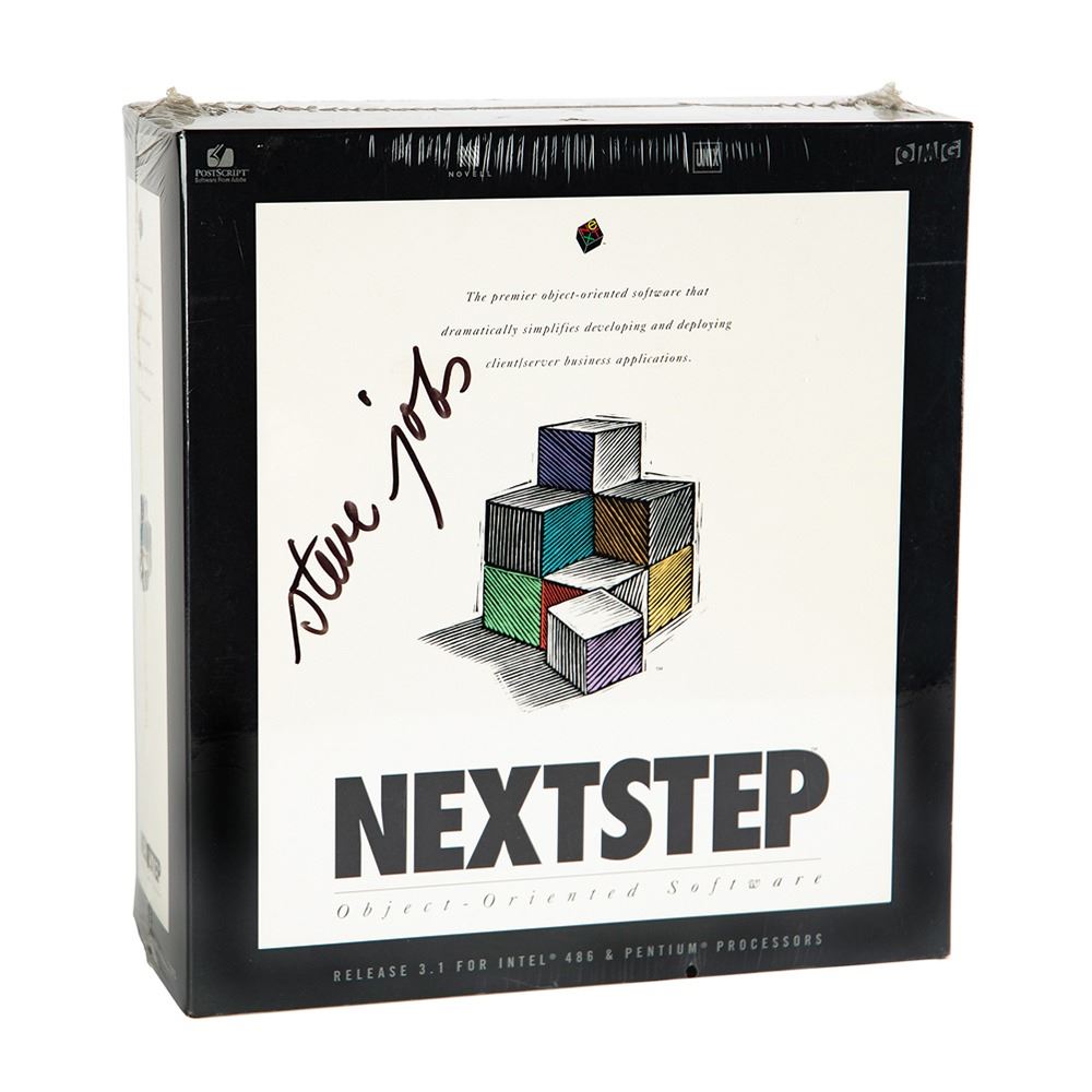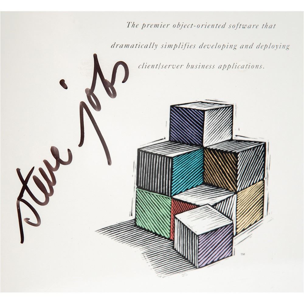 The consignor of this piece was a co-founder of Bindco, the company responsible for designing the NeXTSTEP software packaging, as well as its manufacture, assembly, storage, and shipping. He worked directly with Jobs on the design of the box, which was complicated by the fact that Jobs didn't want any white edges to be visible. When the packaging was ready and the first box of software was produced, Jobs requested that he receive the first copy (i.e. first serial number) of the box of software. After complying with that request, the consignor made a box for himself with the serial #000 (inside the CD digipak) and asked Steve Jobs' assistant to have Steve sign it for him, which Steve did. Bindco then shrink-wrapped the box—complete with software, manuals, and registration card inside—which is the state that it remains in to this day.