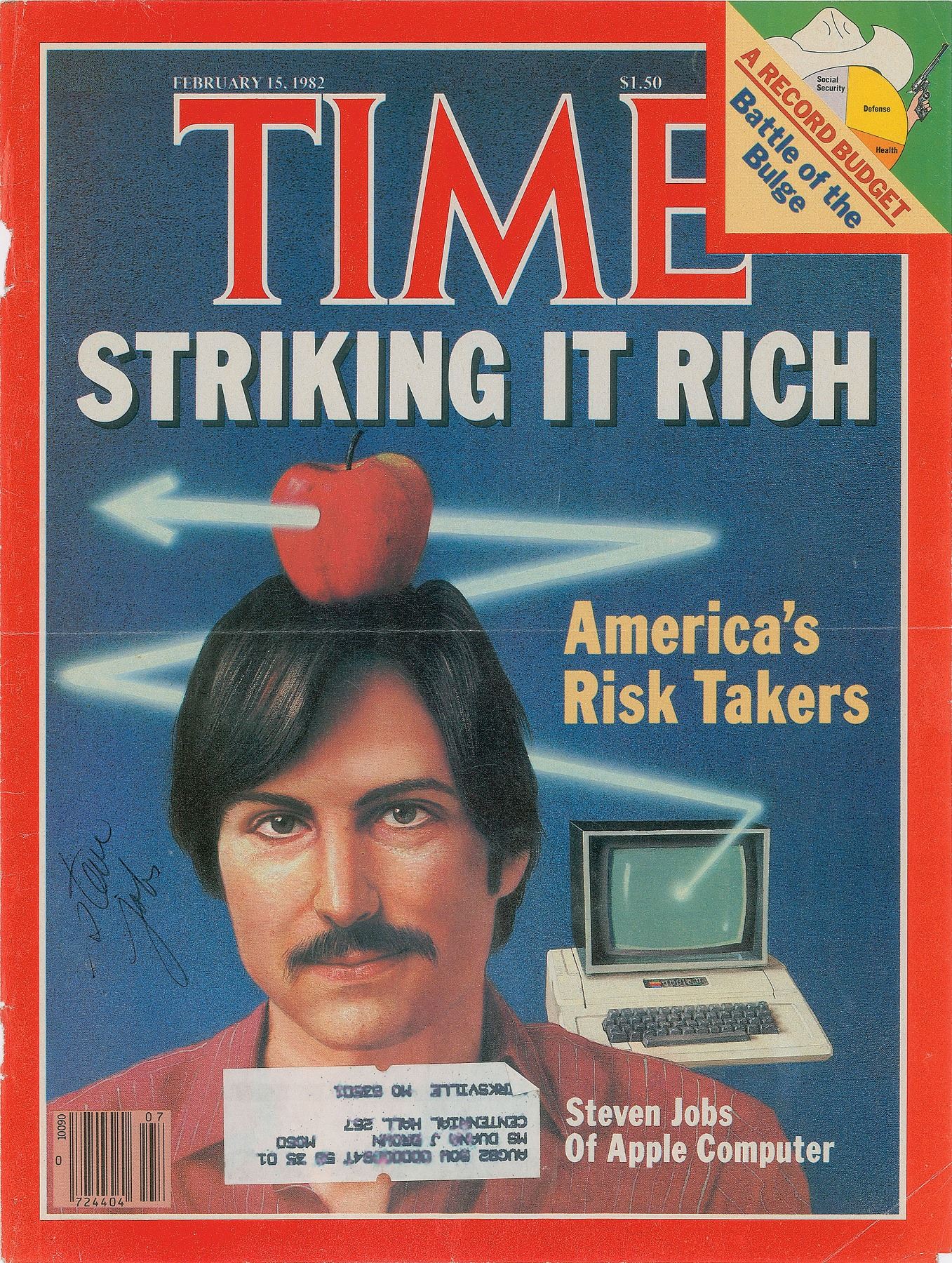 Rare magazine cover featuring Steve Jobs removed from the February 15, 1982 issue of Time, 8.25 x 10.75, beautifully signed in the lower left in black ink, “steve jobs.” The cover story, “Striking It Rich,” portrays “Steven Jobs of Apple Computer” as one of “America’s Risk Takers.” In very good to fine condition, with scattered light creasing, a central horizontal mailing fold, and a light paperclip impression to the top edge. Accompanied by full letters of authenticity from PSA/DNA and Beckett Authentication Services, and a letter of provenance from the consignor.