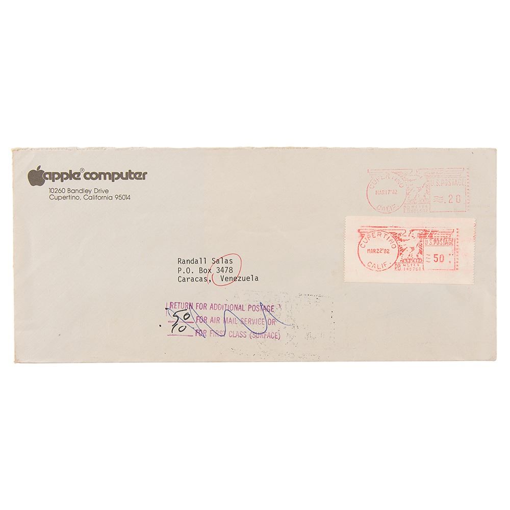 Rare magazine cover featuring Steve Jobs removed from the February 15, 1982 issue of Time, 8 x 10.5, neatly signed in the lower left in black ink, “steve jobs.†The cover story, “Striking It Rich,†portrays “Steven Jobs of Apple Computer†as one of “America’s Risk Takers.†In fine condition, with intersecting folds and a trimmed left edge. Encapsulated in a PSA/DNA authentication holder. Accompanied by the original Apple Computer mailing envelope, postmarked at Cupertino, California, on March 17, 1982.
