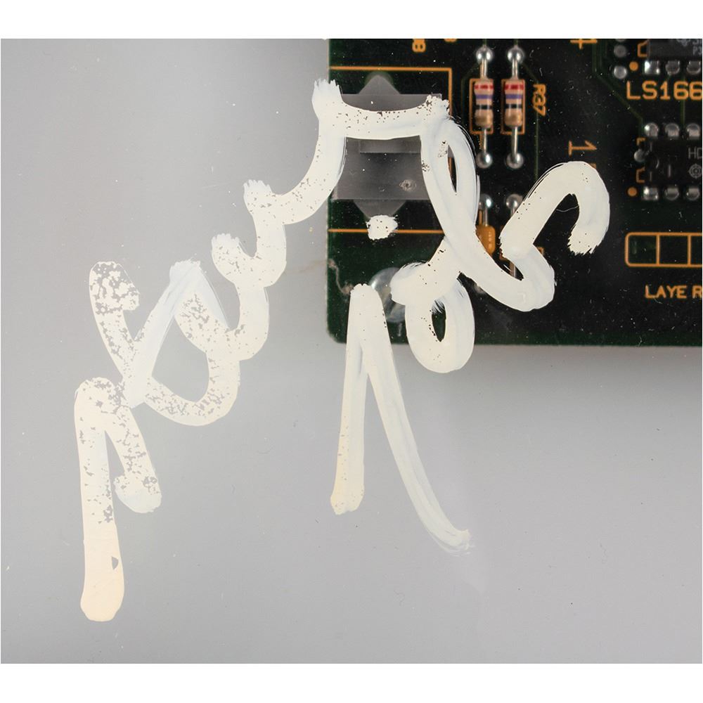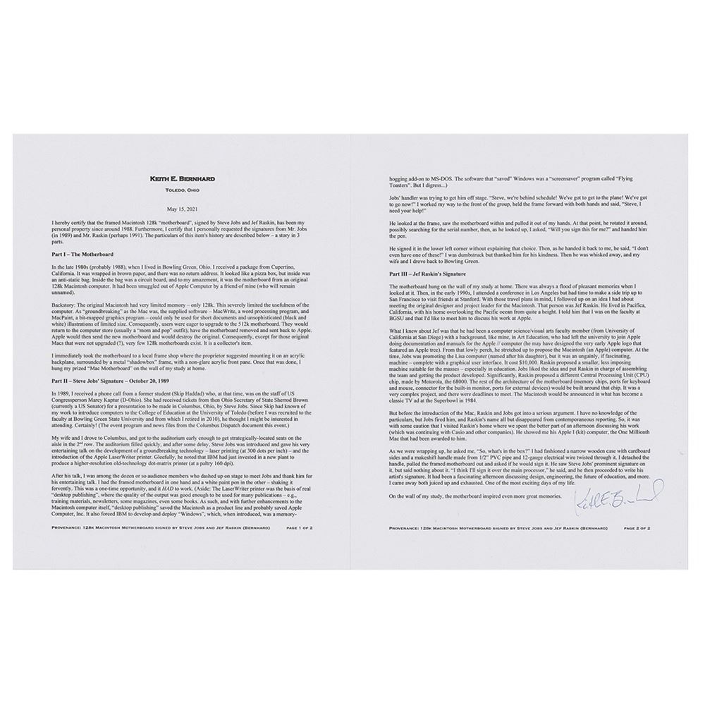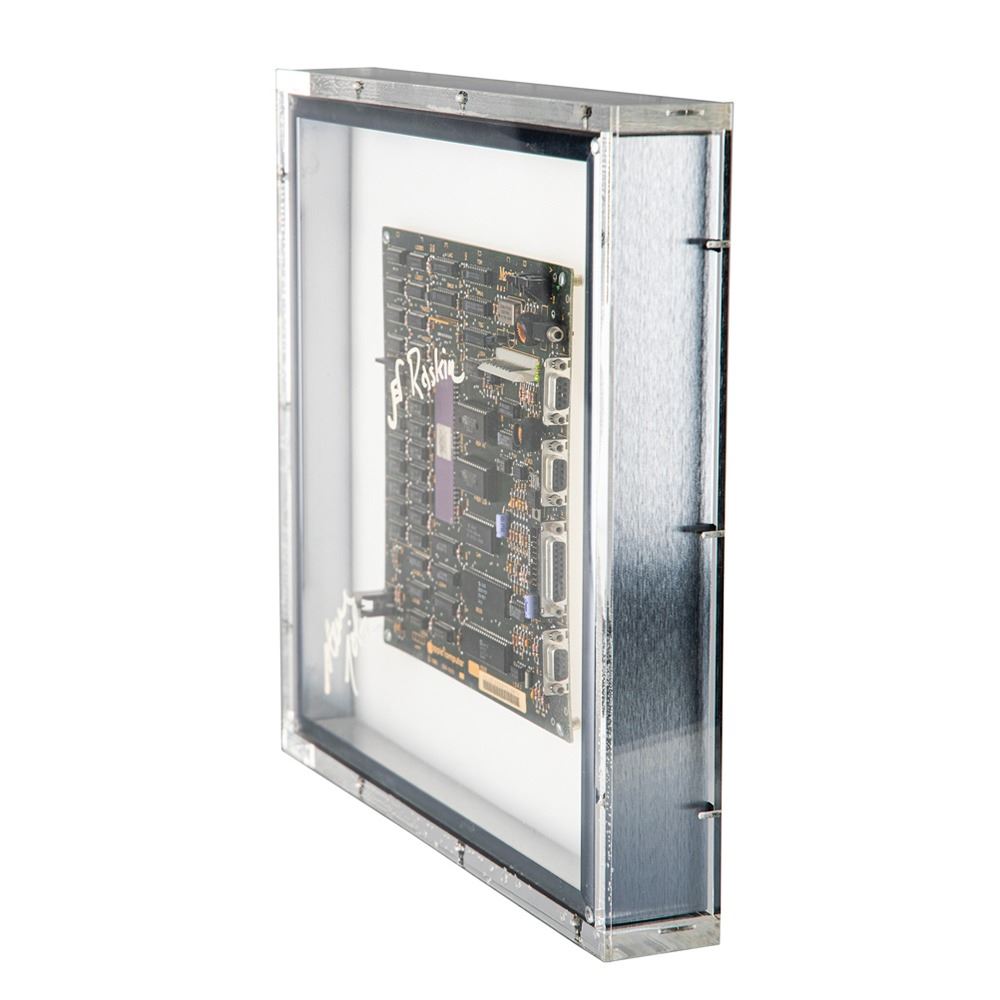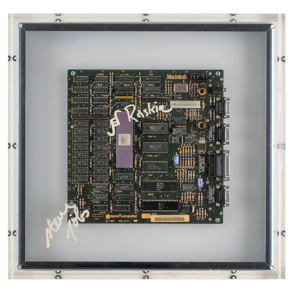 Rare custom-built display featuring an original Macintosh 128k logic board mounted on white acrylic and framed, signed on the non-glare front pane in white paint pen by the Apple co-founder, "steve jobs," and by the father of the Macintosh, "Jef Raskin." Both signatures were obtained in person: Jobs following his presentation at Ohio's Excellence in Government Conference on October 20, 1989, and Raskin during a private meeting at his home in the early 1990s. The signed shadowbox display has since been protected by a thick 15.5Ë x 14.5Ë x 2.5Ë acrylic frame. In fine condition, with slight irregular adhesion to Jobs' signature.