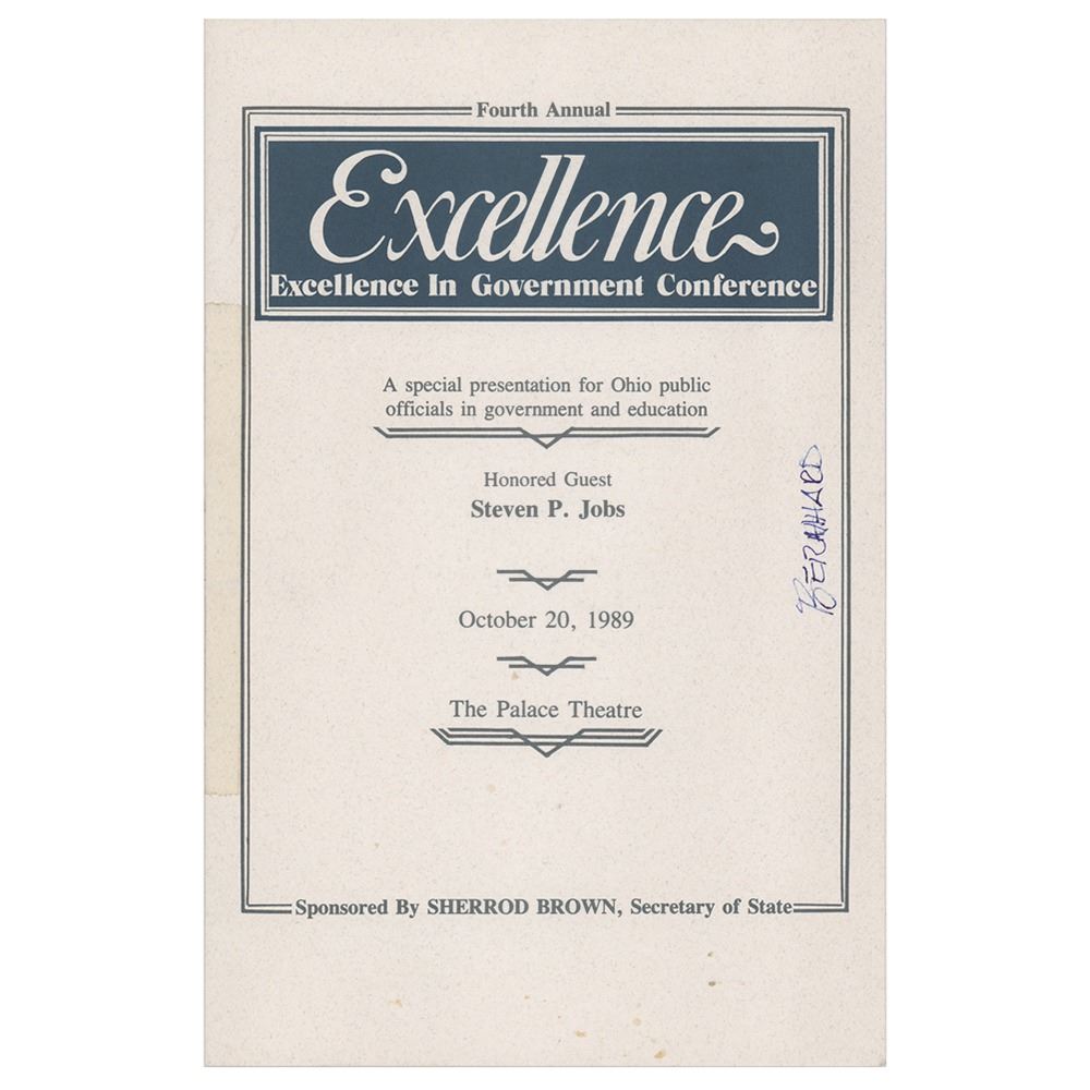 In 1989, when he was invited to attend Jobs's presentation on laser printing for Ohio public officials in government and education, he brought the frame with him in hopes of getting it autographed: "After his talk, I was among the dozen or so audience members who dashed up on stage to meet Jobs and thank him for his entertaining talk. I had the framed motherboard in one hand and a white paint pen in the other—shaking it fervently…Jobs' handler was trying to get him off stage. 'Steve, we're behind schedule! We've got to get to the plane! We've got to go now!' I worked my way to the front of the group, held the frame forward with both hands and said, 'Steve, I need your help!…Will you sign this for me?'…He signed it in the lower left corner without explaining that choice. Then, as he handed it back to me, he said, 'I don't even have one of these!' I was dumbstruck but thanked him for his kindness."