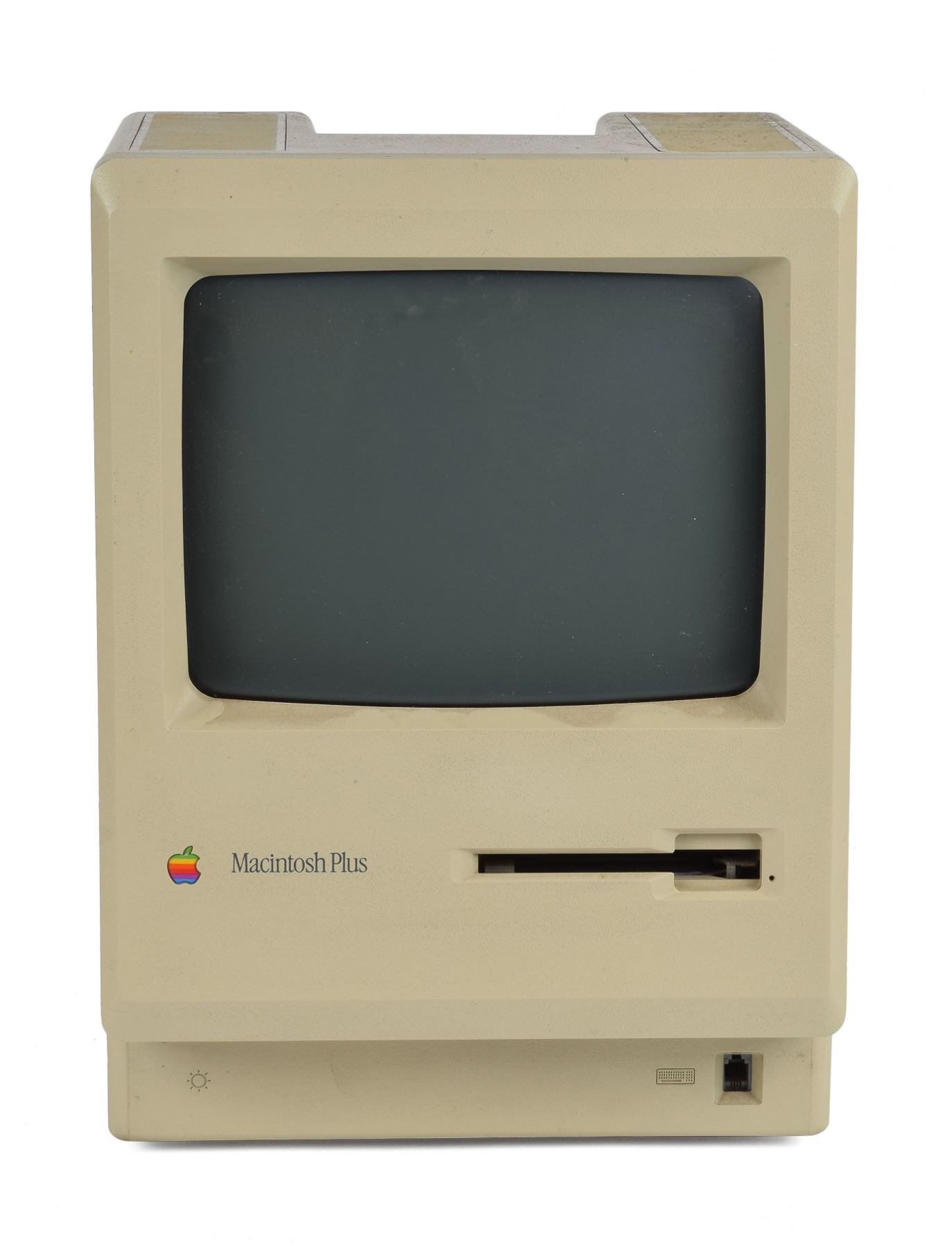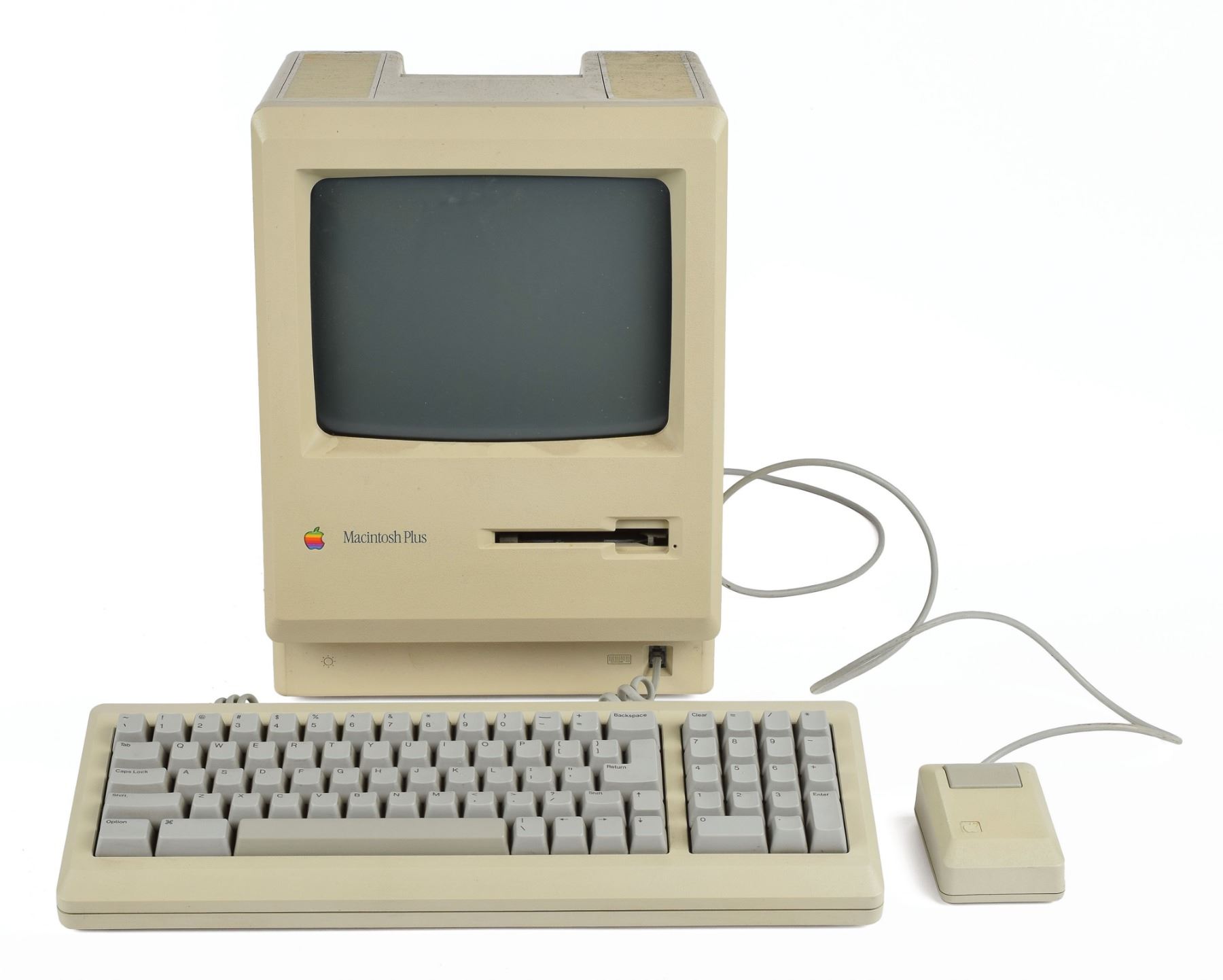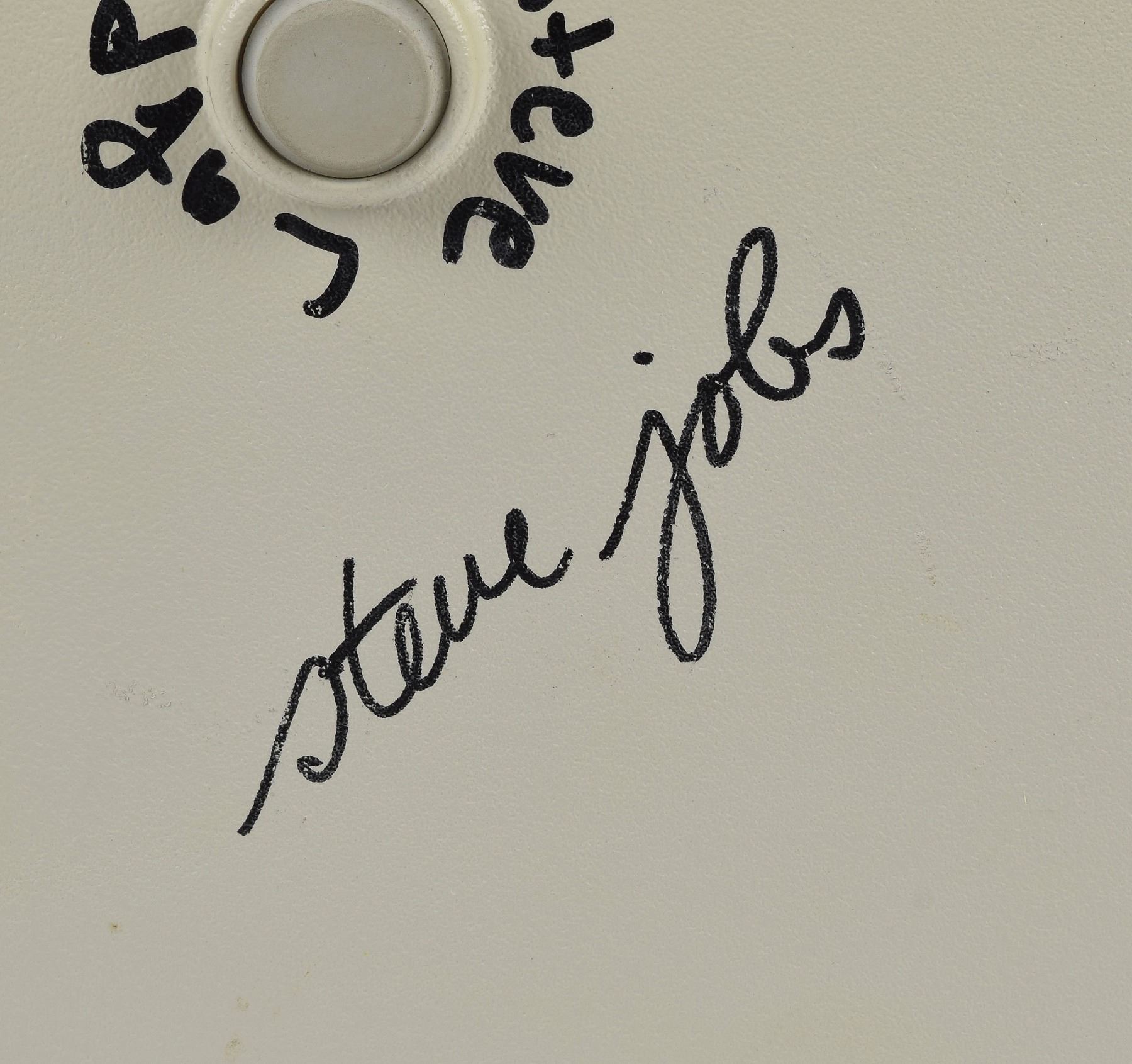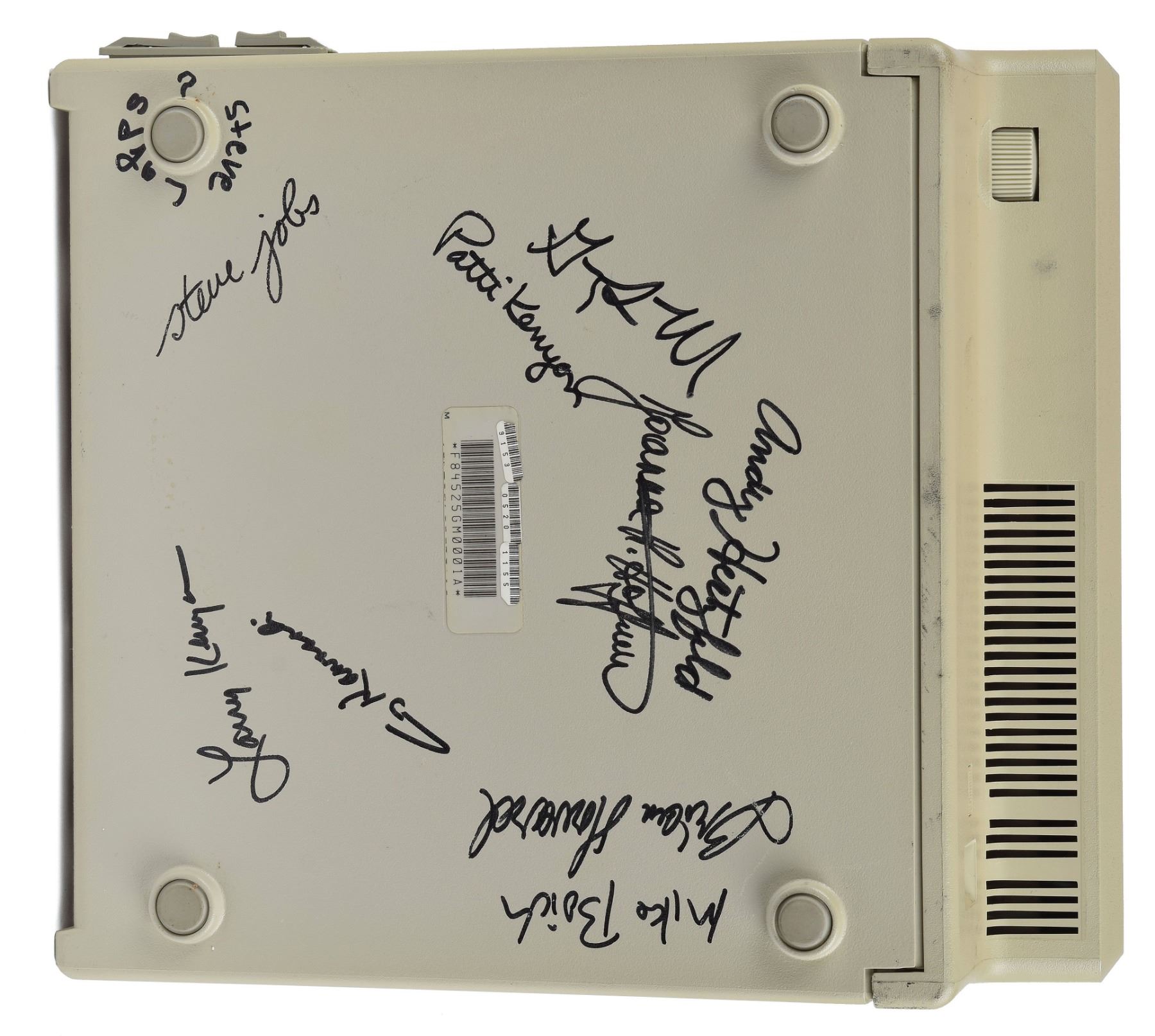 Amazing original Apple Macintosh Plus 1Mb personal computer, serial no. F84525GM0001A, signed on the bottom of the beige-colored case in black felt tip by Steve Jobs along with nine key members of Apple's Macintosh team: Andy Hertzfeld, Patti Kenyon, Guy L. 'Bud' Tribble, Joanna R. Hoffman, Steve Capps, Larry Kenyon, Mike Boich, Brian Howard, and Guy Kawasaki. Complete with its original mouse and keyboard. In fine condition. Accompanied by full letters of authenticity from PSA/DNA and Beckett Authentication Services, and a letter of provenance from the consignor.