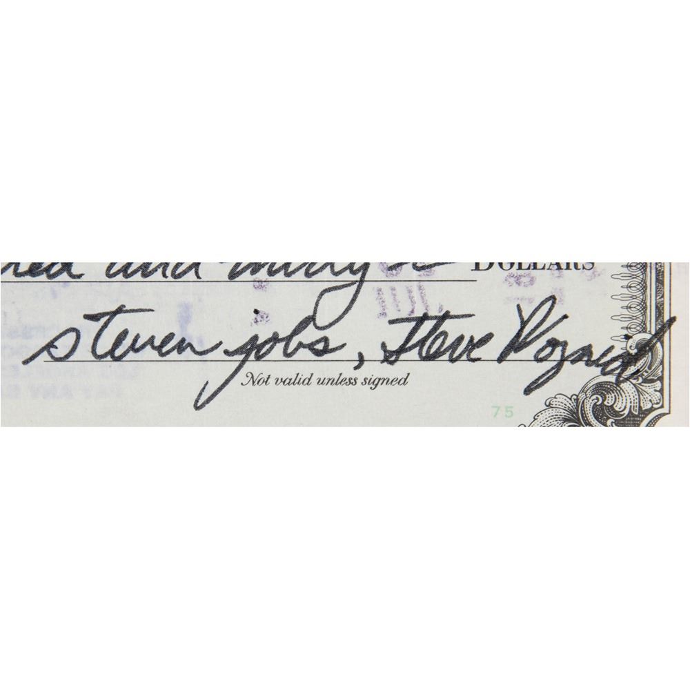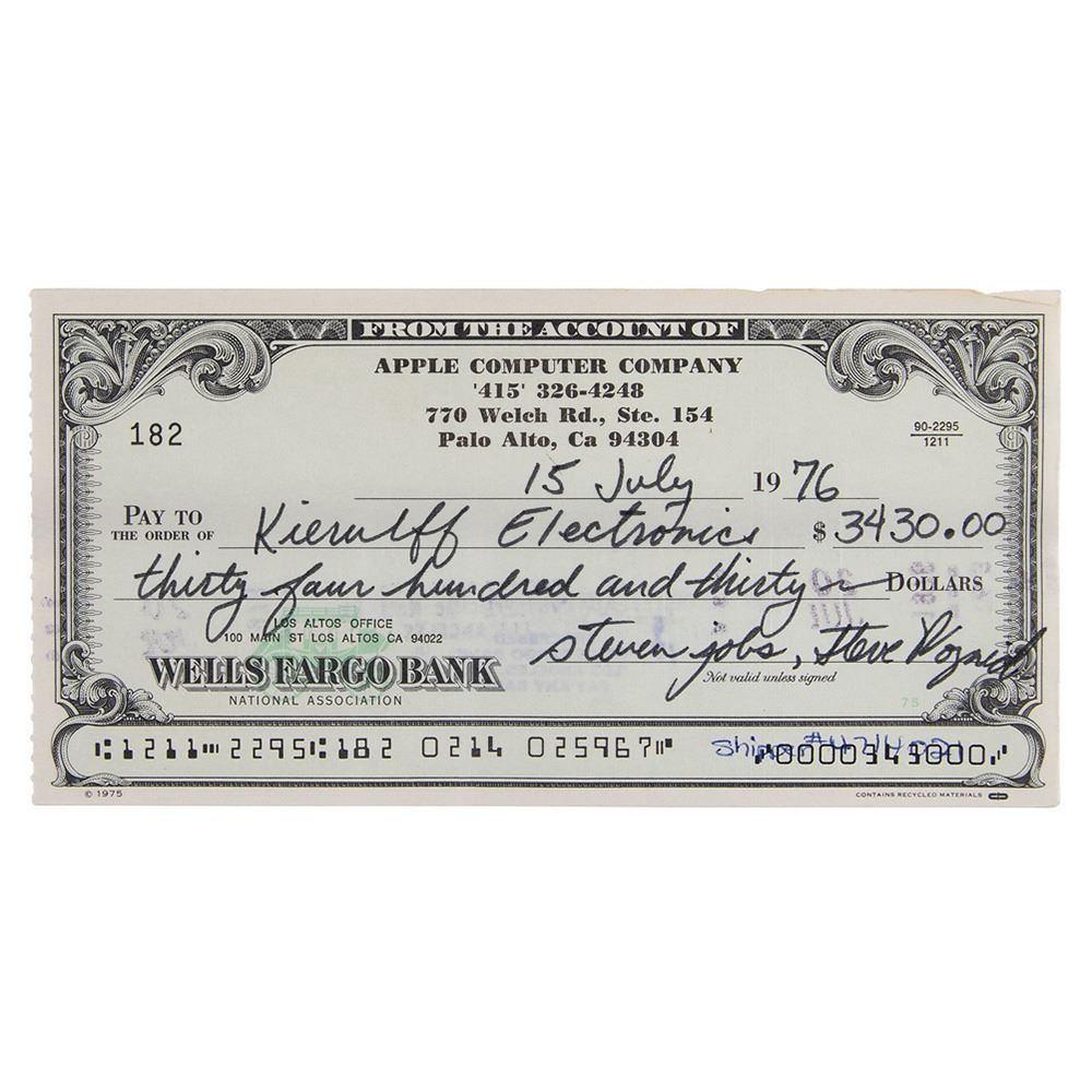 Excessively rare and absolutely historic Apple Computer Company check, 6 x 3, filled out and signed by Steve Jobs, "steven jobs," and countersigned by Steve Wozniak, "Steve Wozniak," payable to Kierulff Electronics for $3430, July 15, 1976. Headed Apple Computer Company, the check uses Apple's first official address at "770 Welch Rd., Ste. 154, Palo Altothe location of an answering service and mail drop that they used while still operating out of the famous Jobs family garage. In very fine condition. Encapsulated in a PSA/DNA authentication holder.