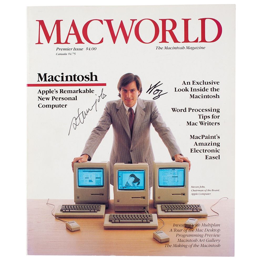 Original issue of Macworld #1 from February 1984, 144 pages, 9 x 10.75, signed and inscribed on the front cover in black felt tip by Apple co-founders Steve Jobs ("steve jobs") and Steve Wozniak ("Woz"). The classic cover depicts Jobs as Apple Computer's chairman of the board, posing with a trio of Macintosh computers upon their introduction to the world. In fine condition. Accompanied by a full letter of authenticity from PSA/DNA.