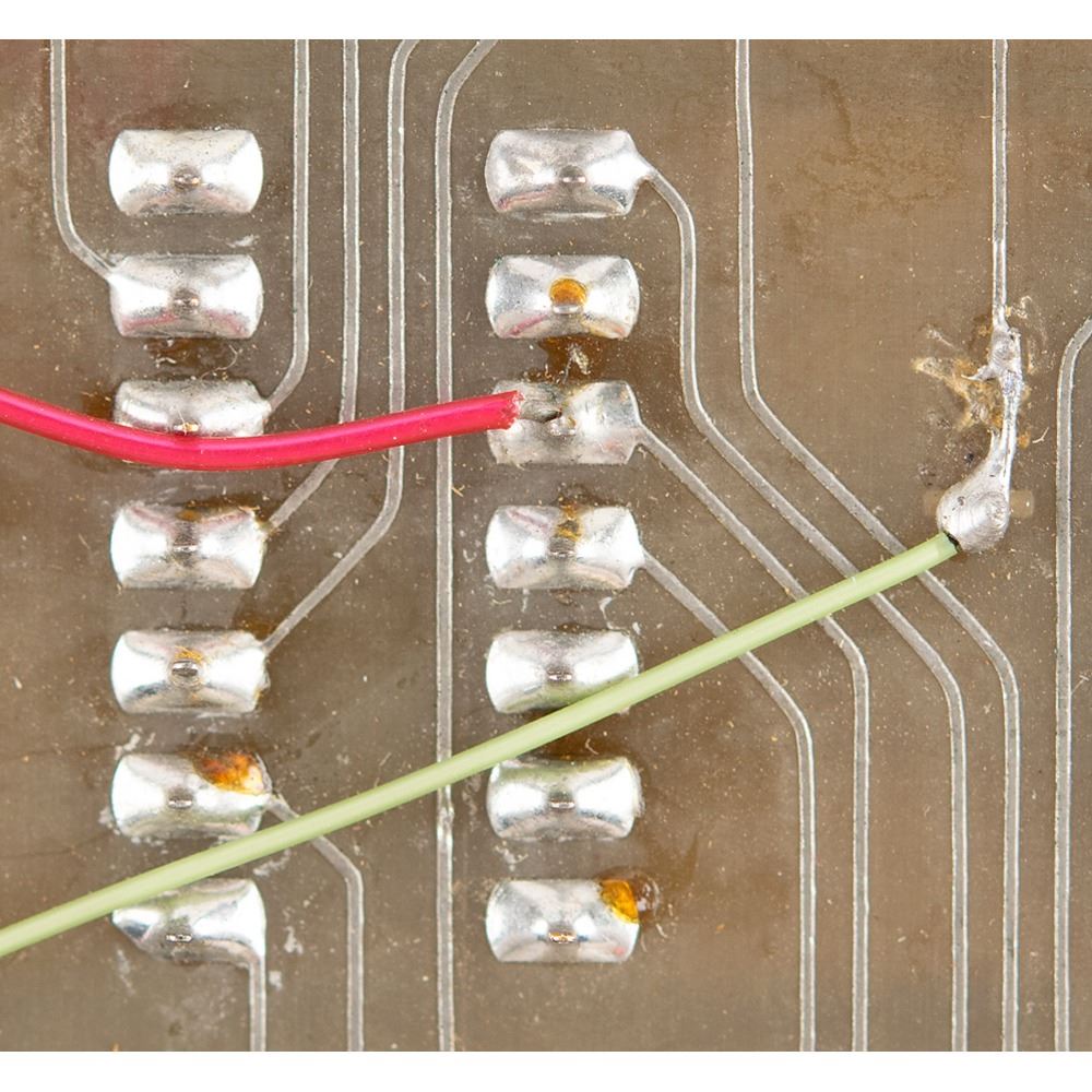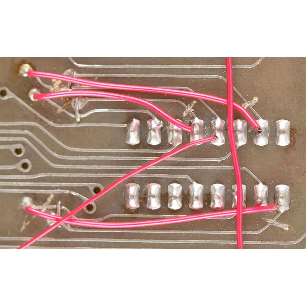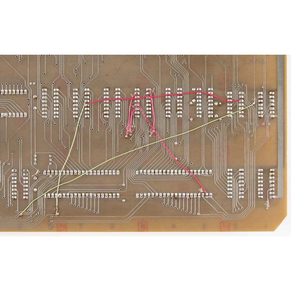 Another important characteristic of this prototype is that it appears to have been hand-soldered by Steve Wozniak, whose unusual 'three handed' technique—wire in one hand, soldering iron in the other, and solder held in his mouth—is evident in the tight 'bubbles' formed at the soldered connections. Several 'point to point' circuit corrections were made on the back of the prototype to make the system functional, and appropriate revisions were incorporated into the first production run of Apple-1 PCBs. The layout of the circuit traces on the prototype board therefore differs from that on the production PCB.