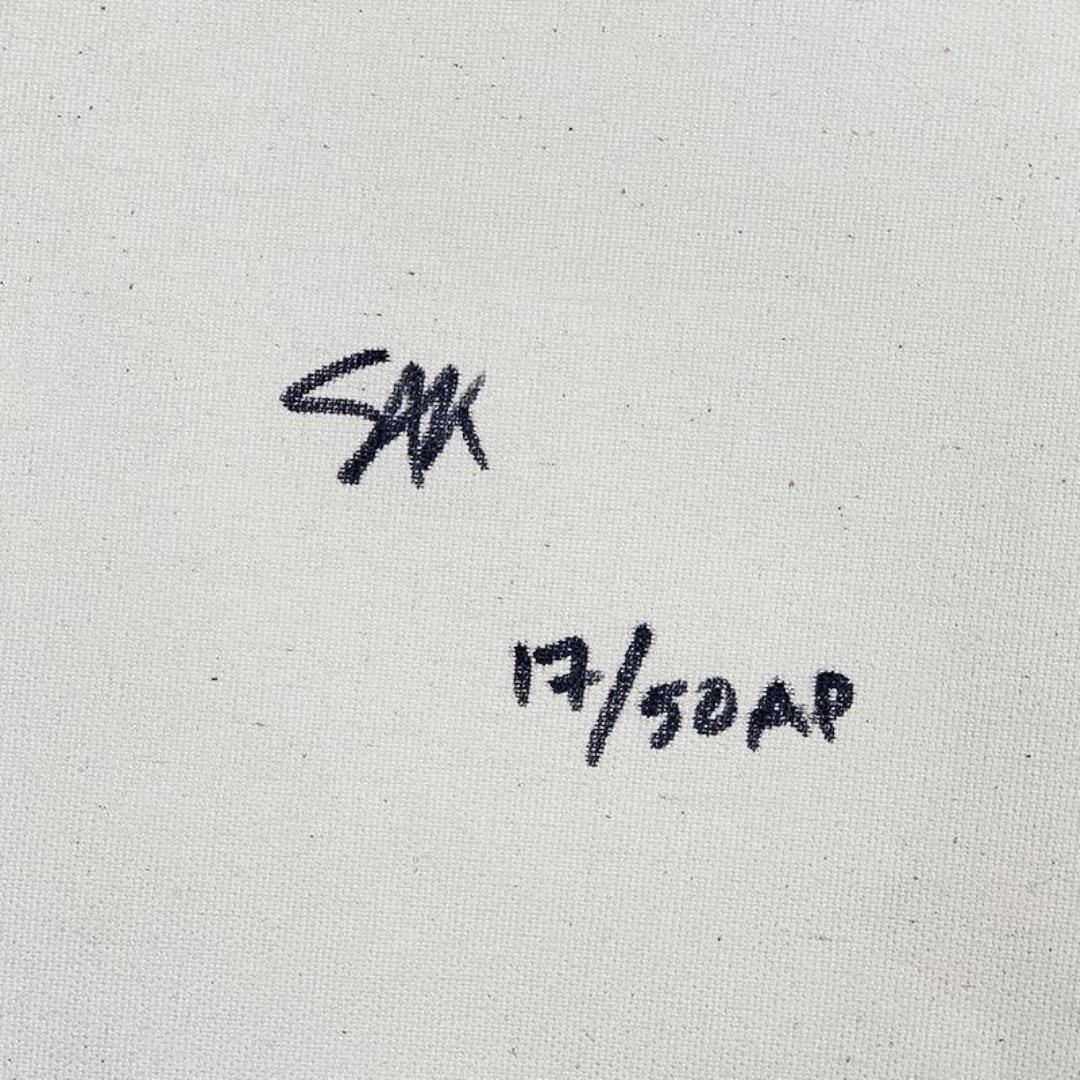 "1896 $2.00 Silver Certificate" is a limited edition hand pulled silkscreen mixed media on canvas by Andy Warhol protege Steve Kaufman (1960-2010). This piece is numbered and AP 17/50 and hand signed inverso. Includes letter of authenticity. As is common with Kaufman's works, this piece may have perceived minor flaws, but is in overall good condition. Measures approximately 18" x 34.5" (image).