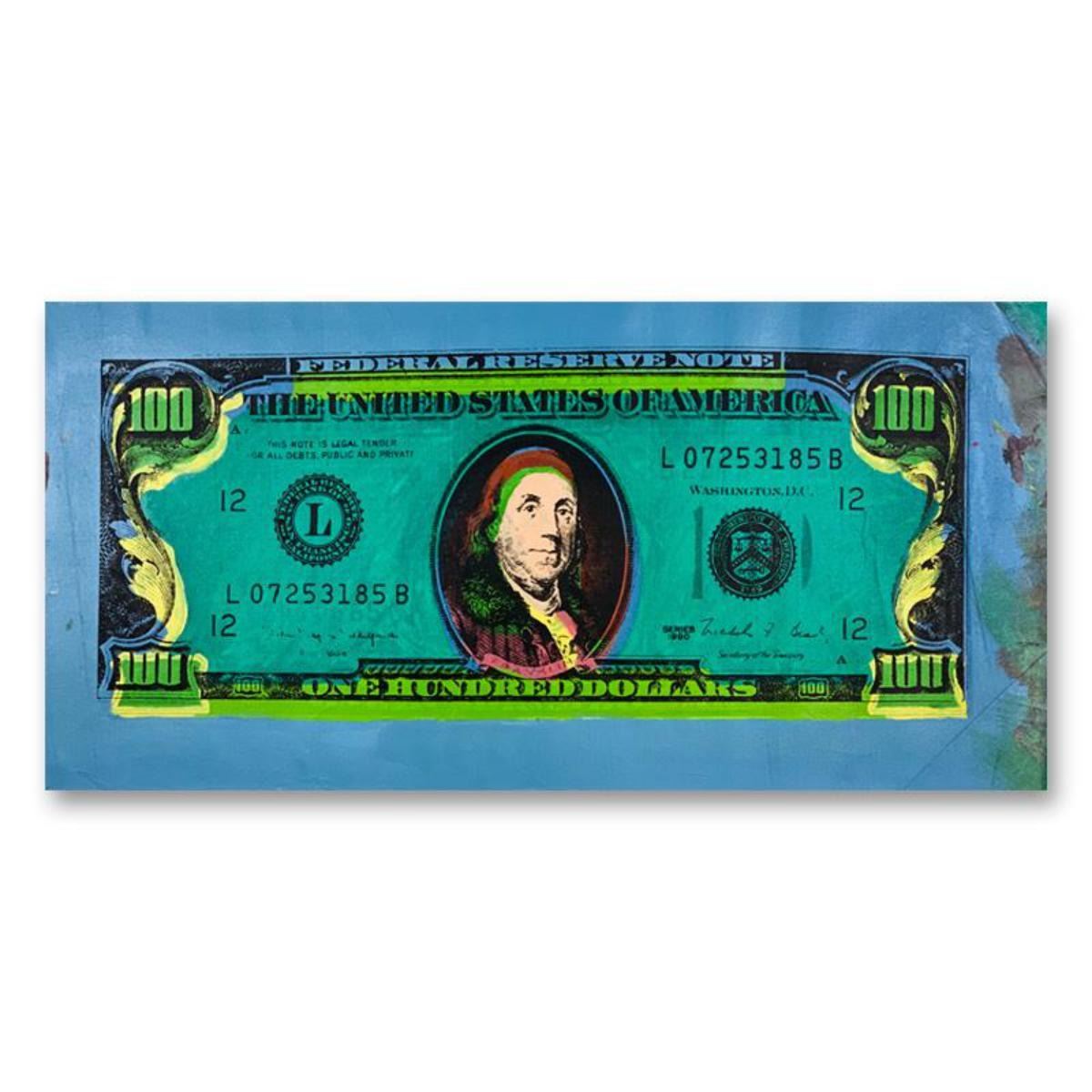 "One Hundred Dollar Old Ben Bill" is an HC edition hand pulled silkscreen mixed media on canvas by Andy Warhol protege Steve Kaufman (1960-2010). This piece is marked HC and hand signed inverso. Includes letter of authenticity. As is common with Kaufman's works, this piece may have perceived minor flaws, but is in overall good condition. Measures approximately 21" x 42" (image). Reference #: 241687