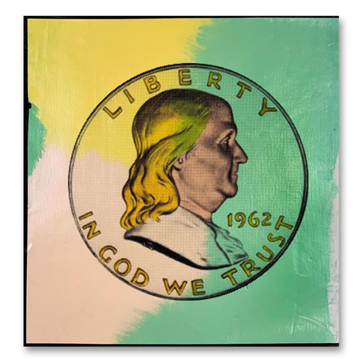 "1962 Liberty Ben" is a limited edition hand pulled silkscreen mixed media on canvas by Andy Warhol protege Steve Kaufman (1960-2010). This piece is numbered and 46/50 and hand signed inverso. Includes letter of authenticity. As is common with Kaufman's works, this piece may have perceived minor flaws, but is in overall good condition. Measures approximately 15" x 14.7" (image). Reference #: 241642