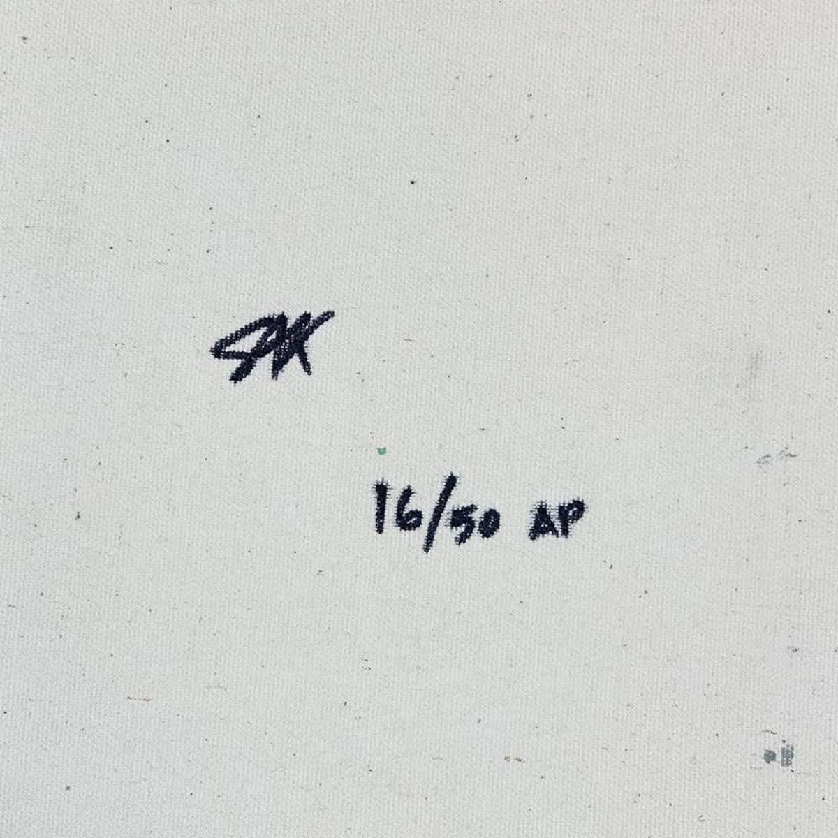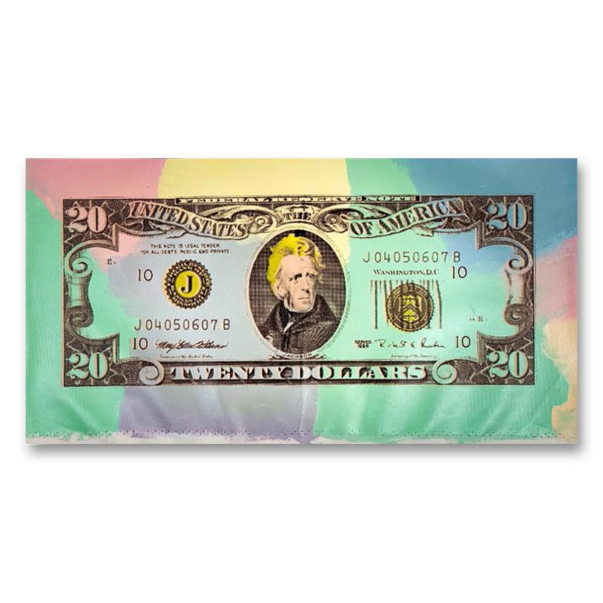 "20 Dollar Bill" is a limited edition hand pulled silkscreen mixed media on canvas by Andy Warhol protege Steve Kaufman (1960-2010). This piece is numbered and hand signed inverso and includes a letter of authenticity. As is common with Kaufman's works, this piece may have perceived minor flaws and creases. Measures approximately 18" x 34" (image). Reference #: 241651