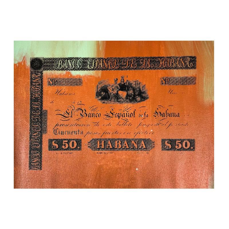 "Banco Espanol de la Habana" is a limited edition hand pulled silkscreen mixed media on canvas by Andy Warhol protege Steve Kaufman (1960-2010). This piece is numbered and 7/50 and hand signed inverso. Includes letter of authenticity. As is common with Ka