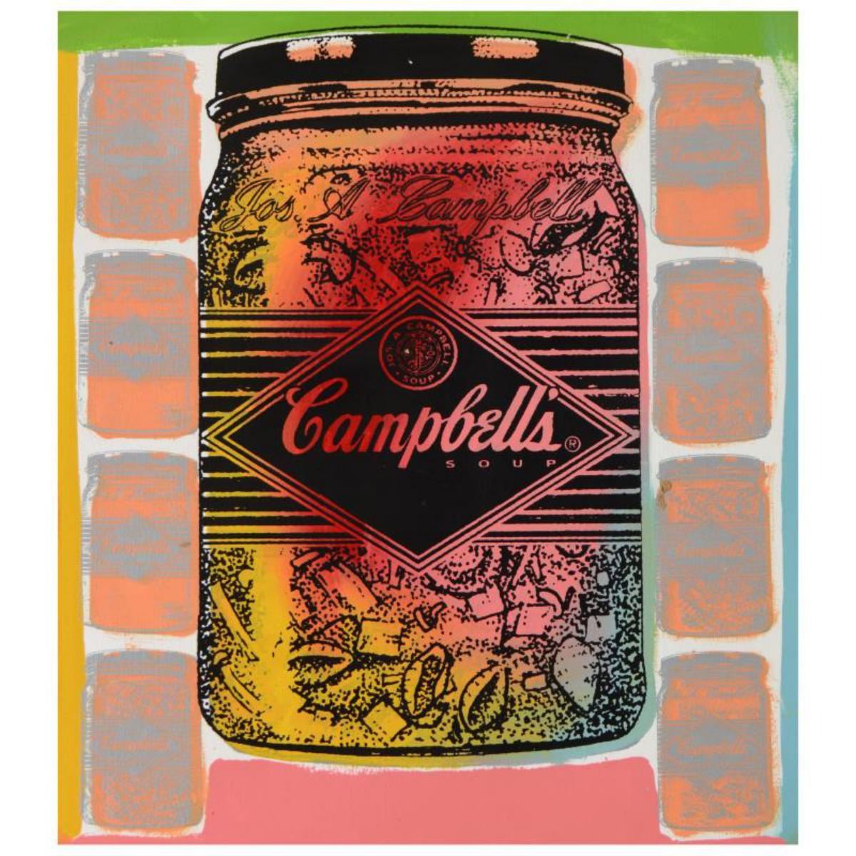 "Campbell's Soup" is a hand painted limited edition silkscreen on canvas by Andy Warhol protege Steve Kaufman (1960-2010). This piece is TP numbered 9/50 and hand signed inverso. Includes letter of authenticity. Measures approx. 11" x 15" (image). Reference #: 236071