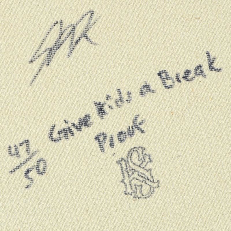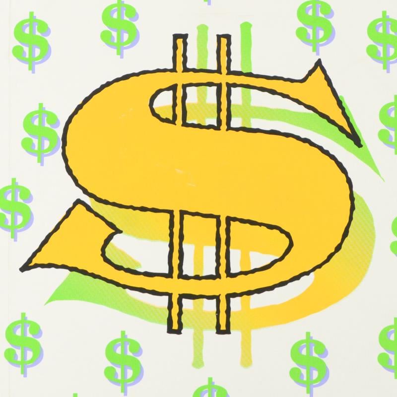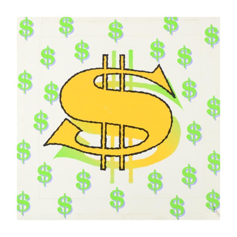 "Dollar Sign" is a limited edition hand pulled silkscreen on canvas by Andy Warhol protege Steve Kaufman (1960-2010). This piece is numbered 47/50 and hand signed inverso. Includes Certificate of Authenticity. Measures approx. 24" x 24" (image). Please note: there are creases in the border area due to being previously stretched, that may be concealed when the piece is re-stretched and framed.