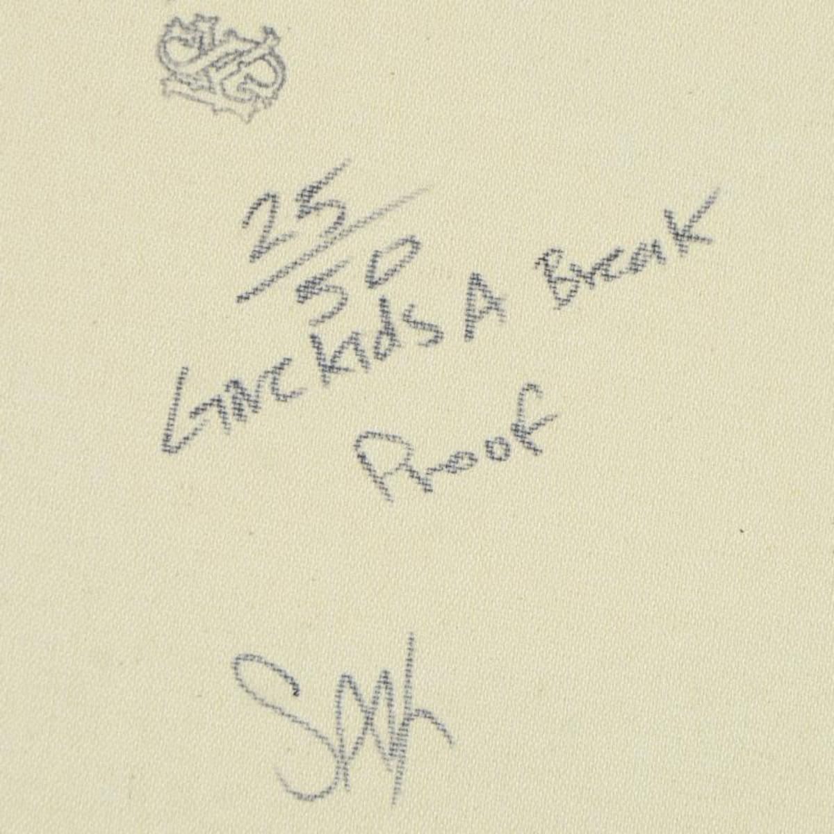 "Dollar Sign" is a limited edition hand pulled silkscreen on canvas by Andy Warhol protege Steve Kaufman (1960-2010). This piece is numbered 25/50 and hand signed inverso. Includes Certificate of authenticity. As is common with Kaufman's works, this piece may have perceived minor flaws, but is in overall good condition. Measures approx. 24" x 24" (image). Please note: there is minor smudging on the bottom right corner that may be concealed when stretched and framed. Reference #: 238594