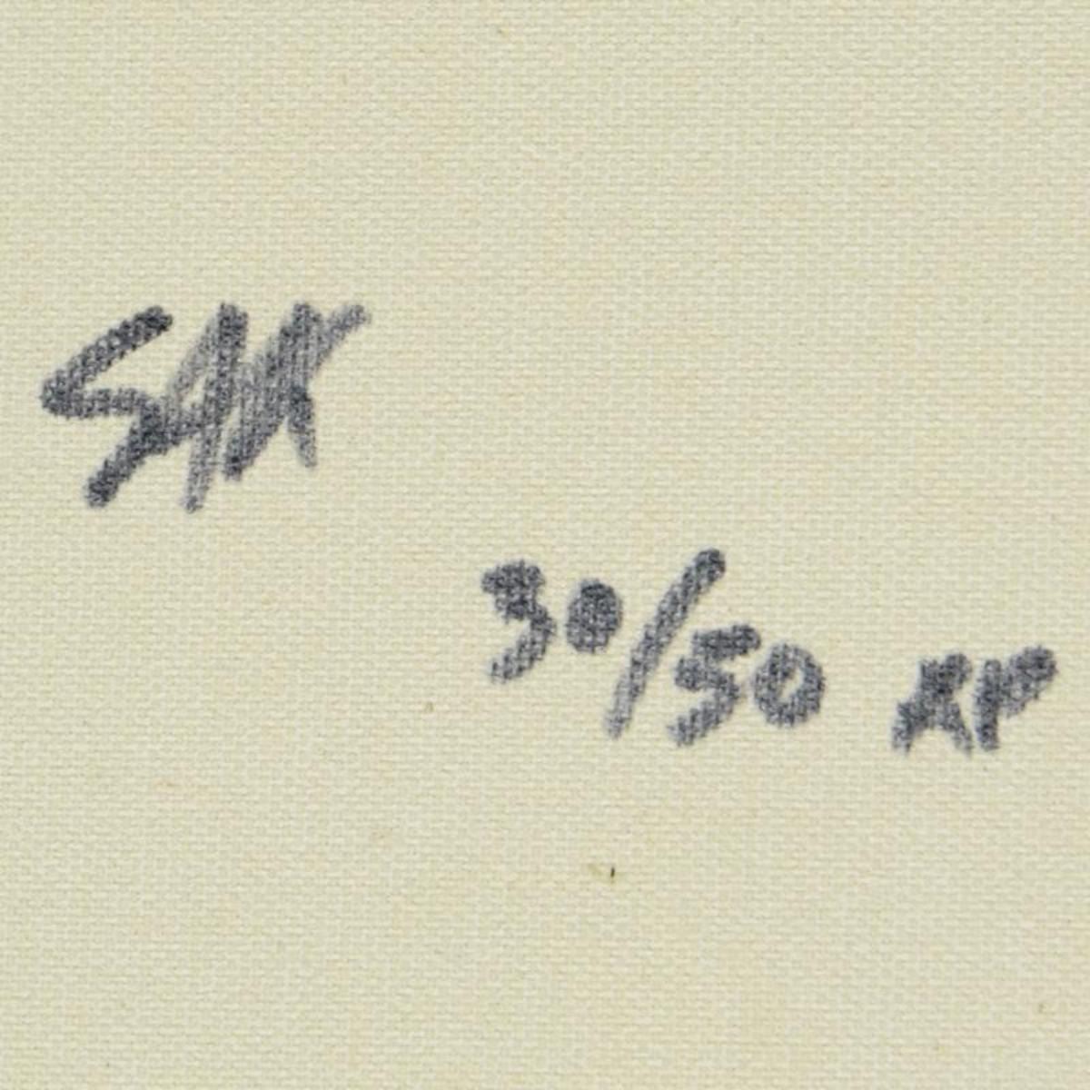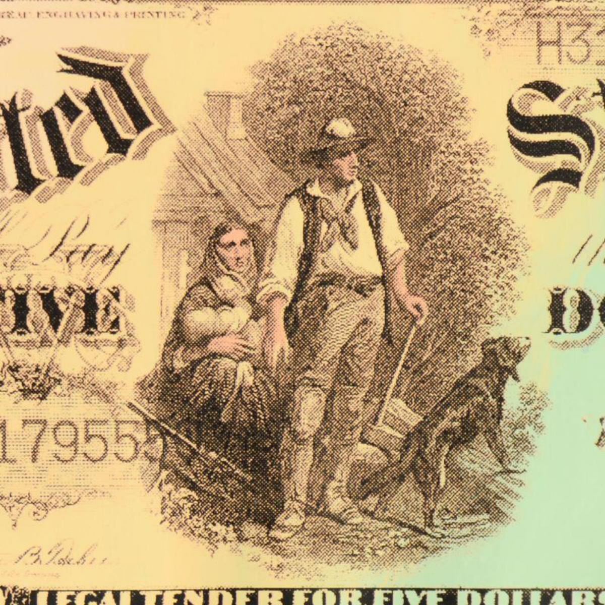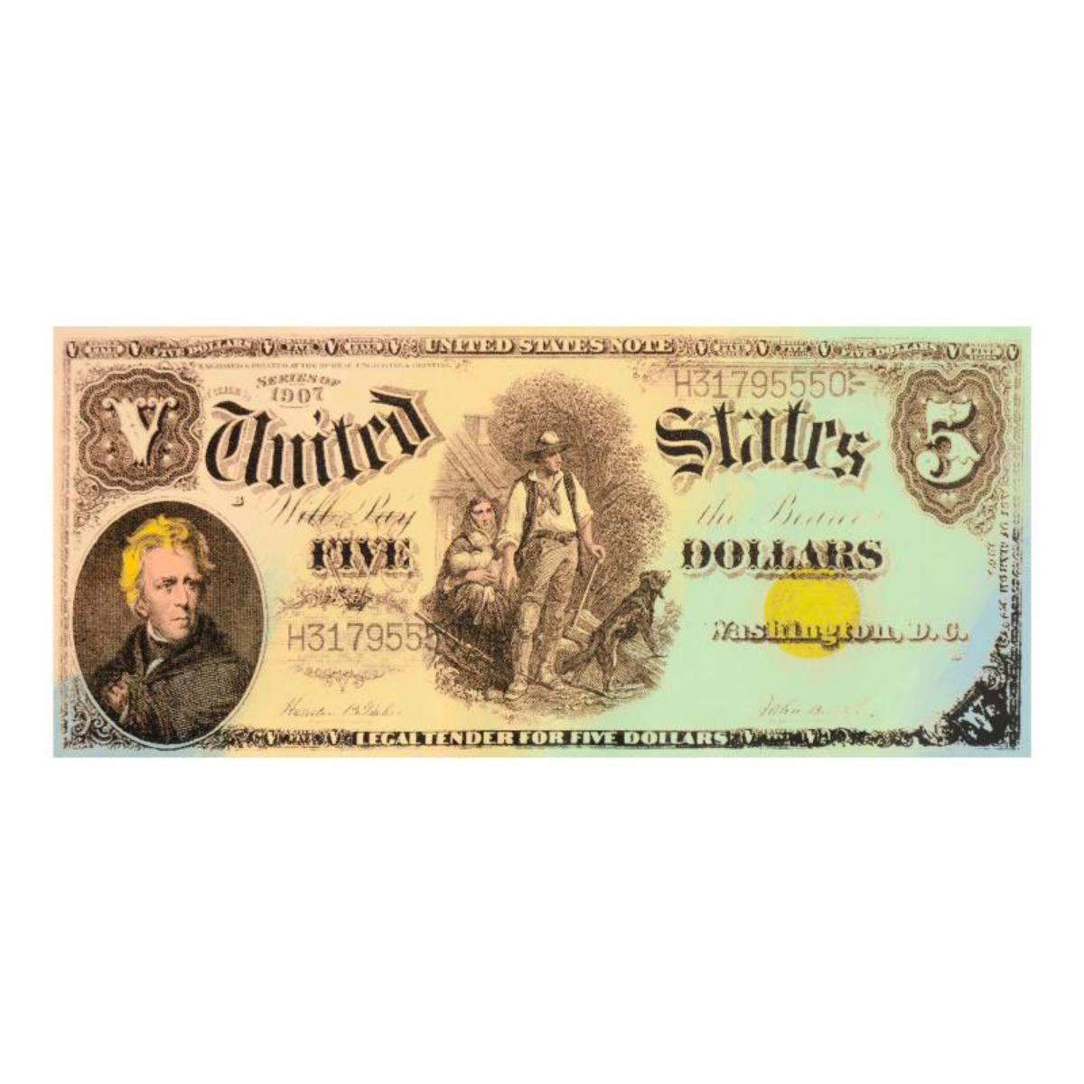 "Five Dollar Bill" is a limited edition hand painted silkscreen on canvas by Andy Warhol protege Steve Kaufman (1960-2010). This piece is AP numbered 30/50 and hand signed inverso. Includes Certificate of Authenticity. Measures approx. 30" x 12" (image). Reference #: 238294