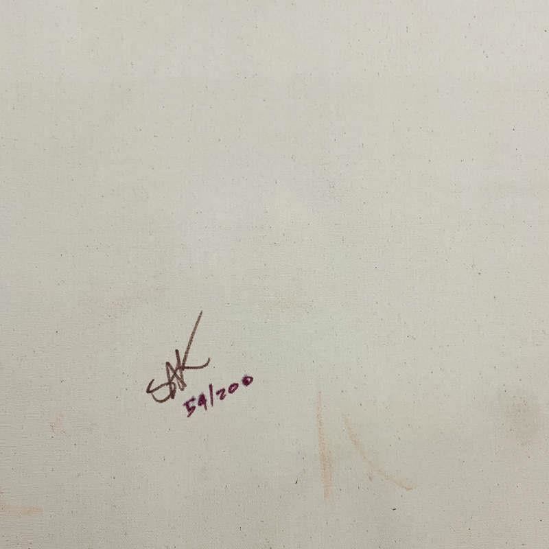"Last Supper Gold" is limited edition hand pulled silkscreen unique mixed media on canvas by Andy Warhol protege Steve Kaufman (1960-2010). This piece is numbered and hand signed inverso and includes a letter of authenticity. As is common with Kaufman's works, this piece may have perceived minor flaws, but is in overall good condition. Measures approximately 17" x 23" before cropping.
