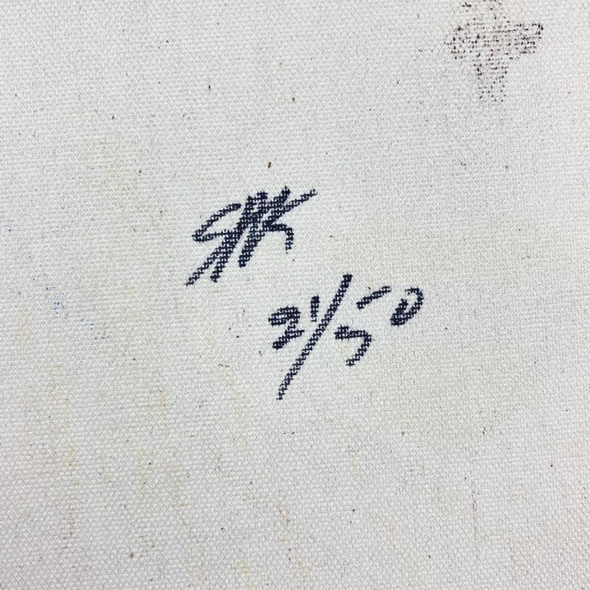 "Jesus Peace State Three" is a limited edition hand pulled silkscreen mixed media on canvas by Andy Warhol protege Steve Kaufman (1960-2010). This piece is numbered and 21/50 and hand signed inverso. Includes letter of authenticity. As is common with Kaufman's works, this piece may have perceived minor flaws and does have some creases. Measures approximately 29" x 29" (image). Reference #: 242081
