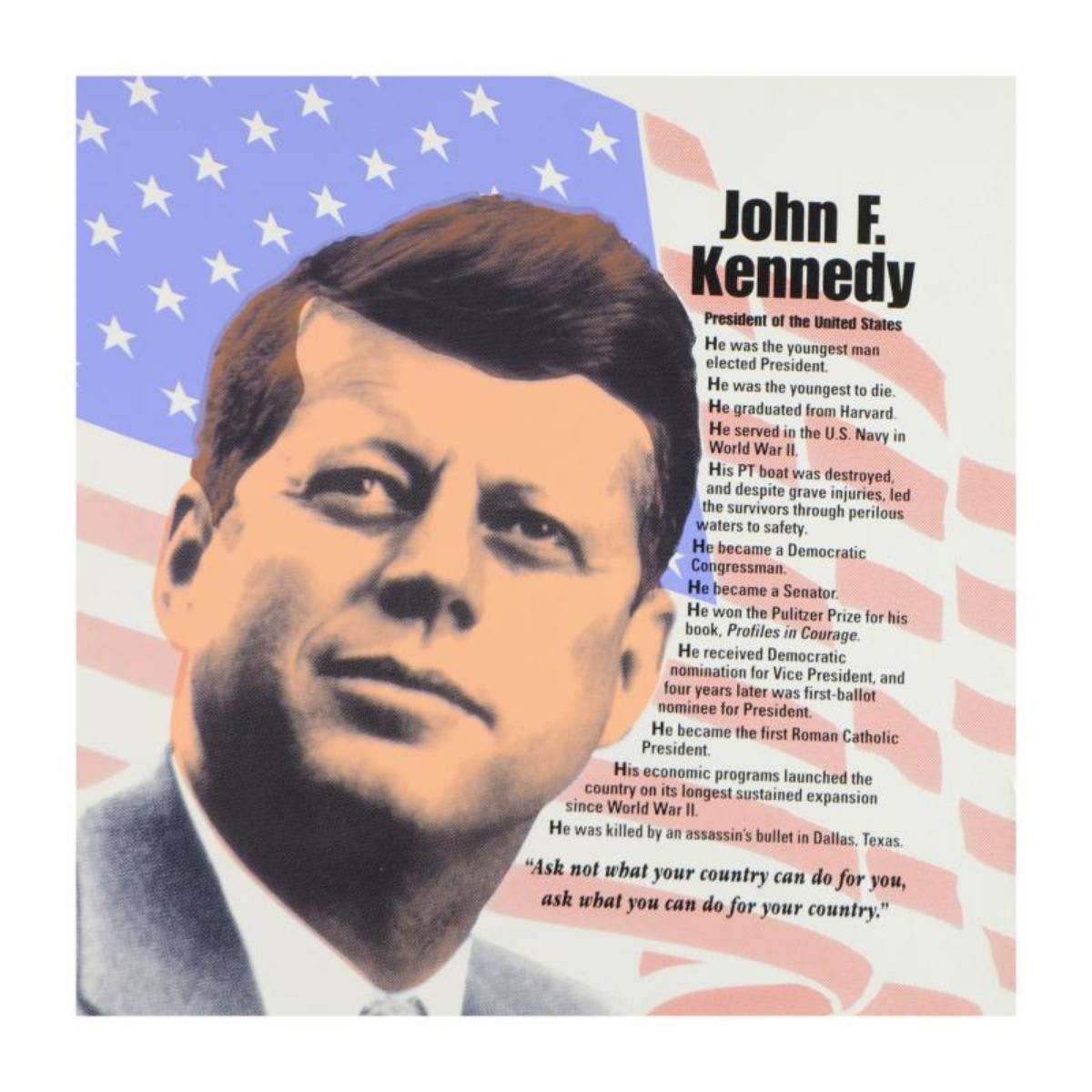 "John F. Kennedy" is a limited edition hand pulled silkscreen on canvas by Andy Warhol protege Steve Kaufman (1960-2010). This piece is numbered 44/50 and hand signed inverso. Includes Certificate of Authenticity. Measures approx. 24" x 24" (image). Reference #: 238339