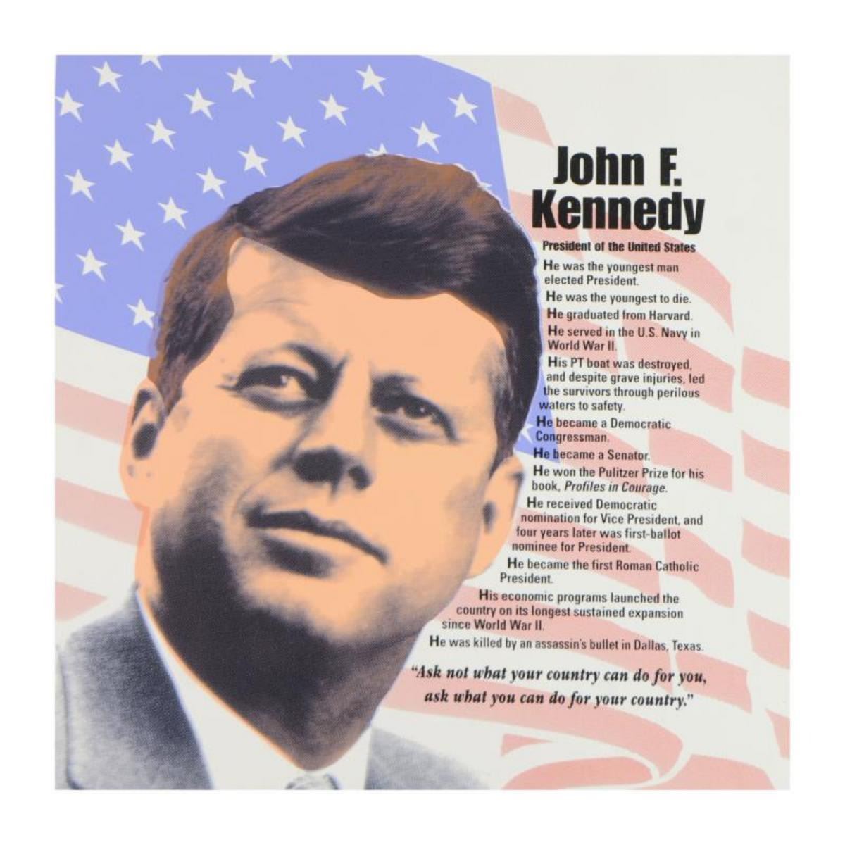 "John F. Kennedy" is a limited edition hand pulled silkscreen on canvas by Andy Warhol protege Steve Kaufman (1960-2010). This piece is numbered 43/50 and hand signed inverso. Includes Certificate of Authenticity. Measures approx. 24" x 24" (image). Reference #: 238338