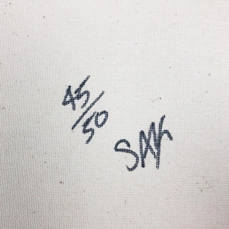 "Jolly Old St. Nick" is a limited edition hand pulled silkscreen mixed media on canvas by Andy Warhol protege Steve Kaufman (1960-2010). This piece is numbered and 45/50 and hand signed inverso. Includes letter of authenticity. As is common with Kaufman's