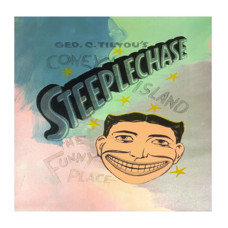 "Steepechase, Coney Island" is a limited edition hand pulled silkscreen mixed media on canvas by Andy Warhol protege Steve Kaufman (1960-2010). This piece is numbered and 45/50 and hand signed inverso. Includes letter of authenticity. As is common with Kaufman's works, this piece may have perceived minor flaws, but is in overall good condition. Measures approximately 17" x 17" (image).