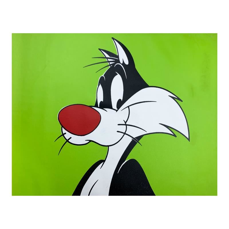 "Sylvester the Cat" is limited edition hand pulled silkscreen unique mixed media on canvas by Andy Warhol protege Steve Kaufman (1960-2010). This piece is numbered and hand signed inverso and includes a letter of authenticity. As is common with Kaufman's works, this piece may have perceived minor flaws, but is in overall good condition. Measures approximately 24.5" x 31" before cropping.