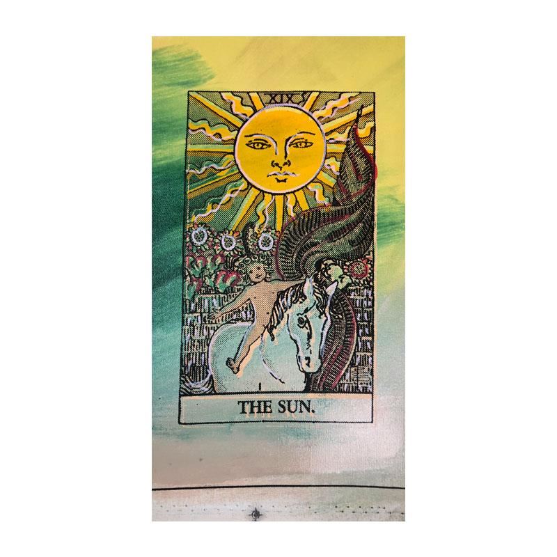 "Tarot, The Sun" is a limited edition hand pulled silkscreen mixed media on canvas by Andy Warhol protege Steve Kaufman (1960-2010). This piece is numbered and 19/50 and hand signed inverso. Includes letter of authenticity. As is common with Kaufman's works, this piece may have perceived minor flaws, but is in overall good condition. Measures approximately 18" x 10" (image).