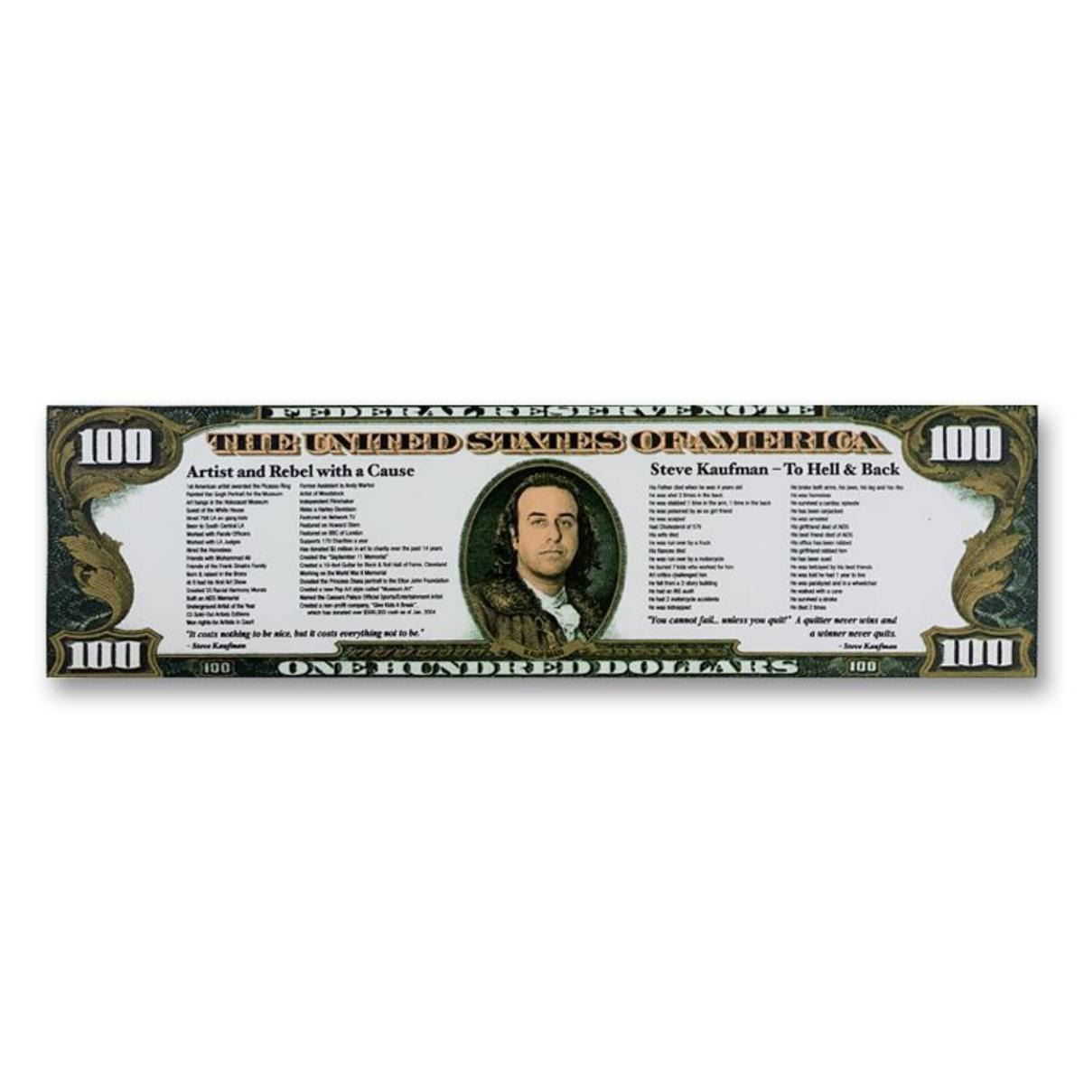 "Steve Kaufman $100.00 Dollar Bill state 2: To Hell and Back" is a hand pulled silkscreen mixed media on canvas by Andy Warhol protege Steve Kaufman (1960-2010). This piece is hand signed inverso. Includes letter of authenticity. As is common with Kaufman's works, this piece may have perceived minor flaws, but is in overall good condition. Measures approximately 17.5" x 54" (image). Reference #: 241698