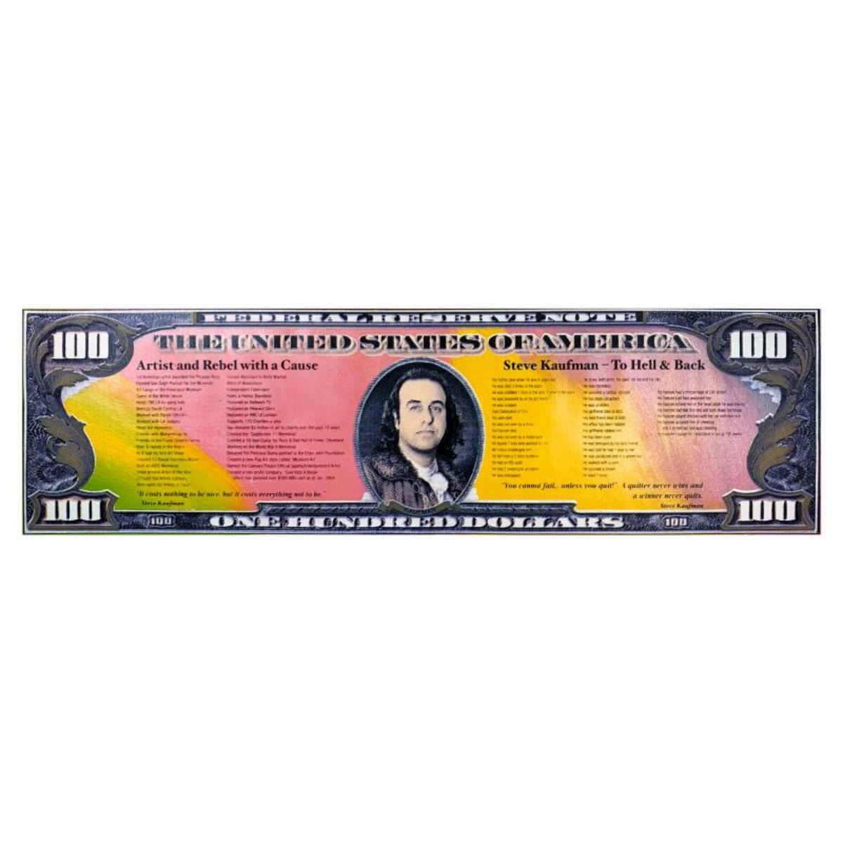 "$100 To Hell and Back" is a limited edition hand pulled silkscreen unique mixed media on canvas by Andy Warhol protege Steve Kaufman (1960-2010). This piece is numbered and hand signed inverso and includes a letter of authenticity. As is common with Kaufman's works, this piece may have perceived minor flaws, but is in overall good condition. Measures approximately 15" x 47" before cropping. Reference #: 249581