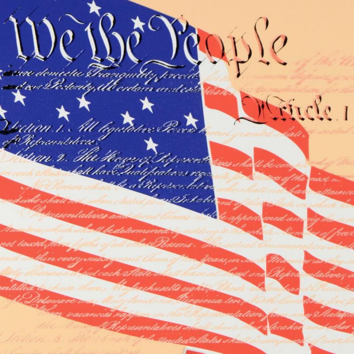 "We the People" is a limited edition silkscreen on canvas by Andy Warhol protege Steve Kaufman (1960-2010). This piece is numbered 45/50 and hand signed inverso. Includes Certificate of Authenticty. Measures approx. 20" x 20" (image). Reference #: 233296