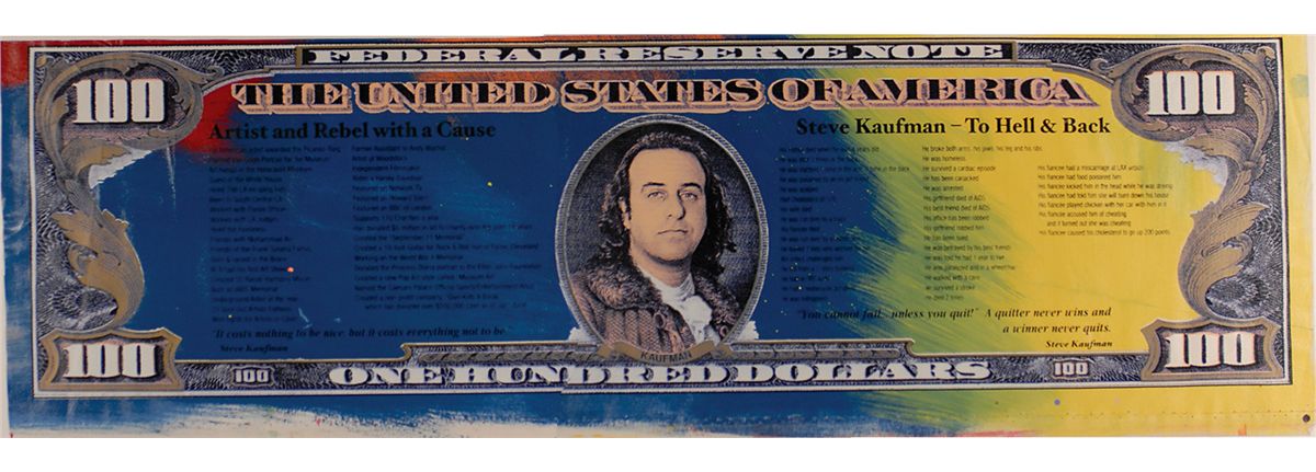 American pop artist (1960–2010) who began his career in Andy Warhol’s ‘Factory.’ Original hand-embellished oil and screen print artwork on unstretched canvas, entitled ‘To Hell & Back’ and featuring a self-portrait on a $100 bill, 47 x 14.75, signed on the reverse in black felt tip, “SAK.” In fine condition.
