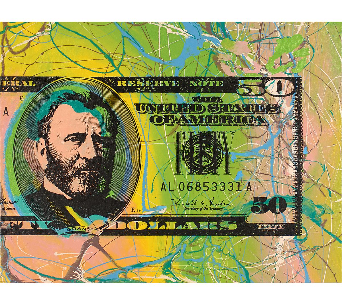 Original limited edition hand-embellished oil and screen print artwork on canvas of Grant on the $50 bill, numbered #4/50 CP, 20 x 15 on stretcher bars, signed on the reverse in black felt tip, “SAK.” In fine condition.