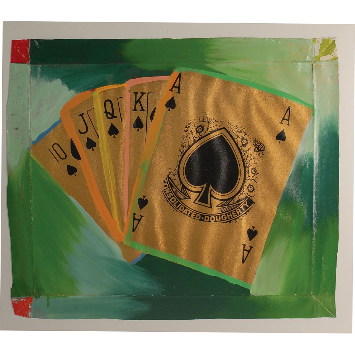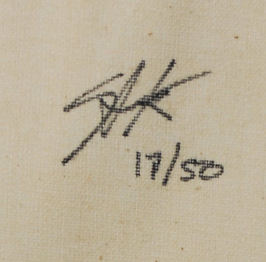 American pop artist (1960–2010) who began his career in Andy Warhol’s ‘Factory.’ Original limited edition hand-embellished oil and screen print artwork on canvas, numbered 17/50, showing a royal straight flush, 22 x 18.75, signed on the reverse in black felt tip, “SAK.” A few creases and impressions to borders from previous framing, otherwise fine condition.