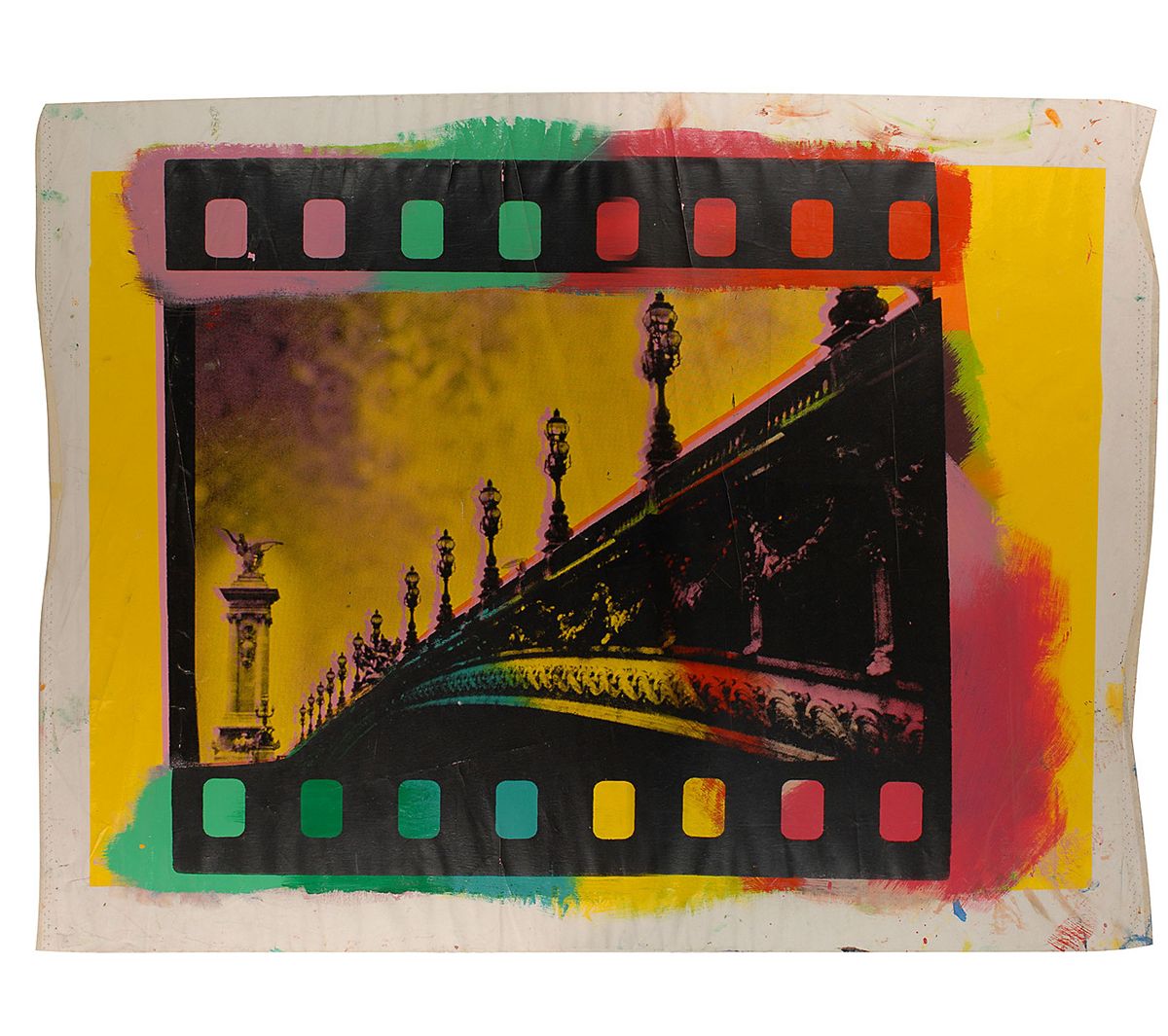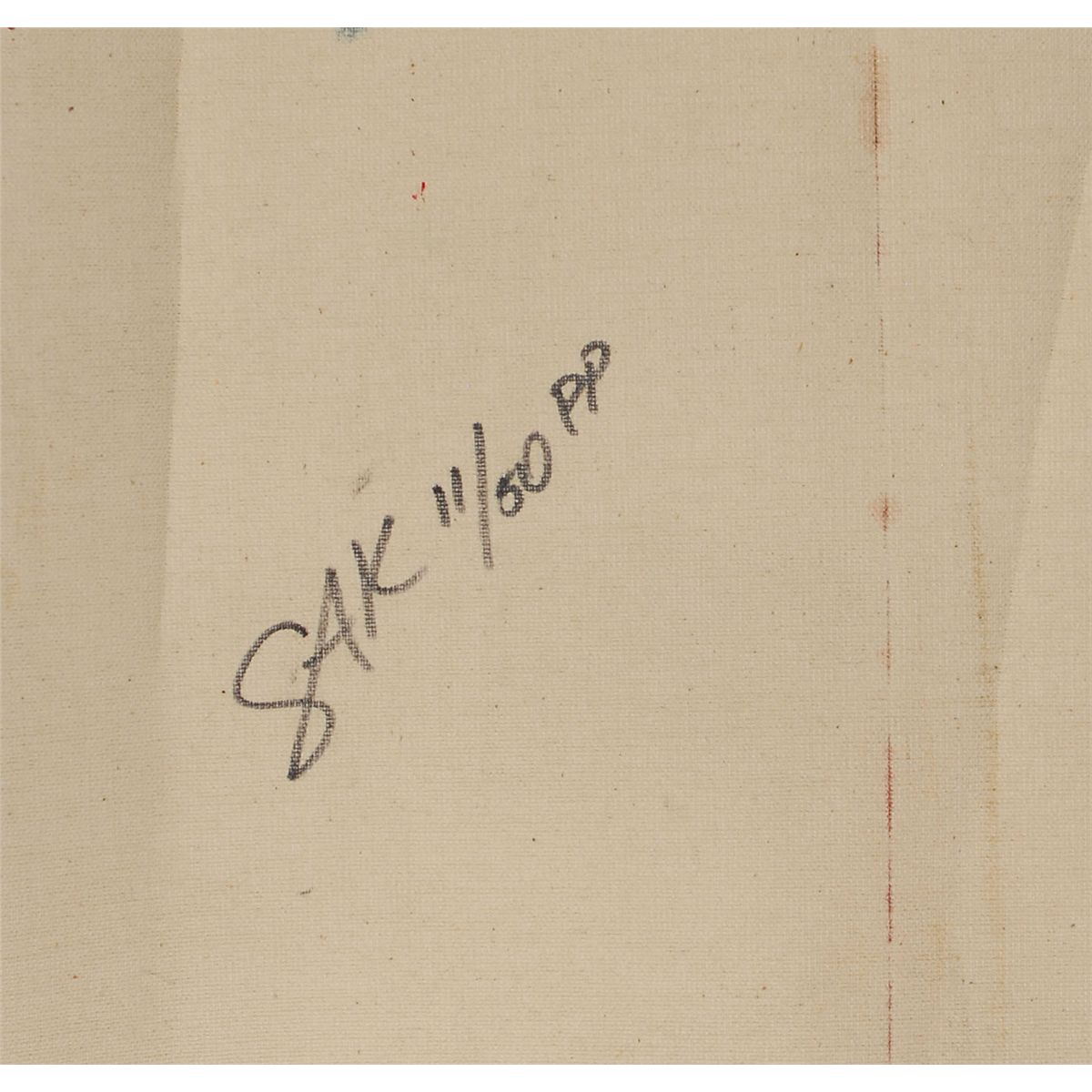 American pop artist (1960–2010) who began his career in Andy Warhol’s ‘Factory.’ Original limited edition hand-embellished oil and screen print of a bridge on unstretched canvas numbered, 11/50 PP, 49.5 x 39, signed on the reverse in black felt tip, “SAK.” In very good condition, with scattered creases, small areas of surface loss, and previous framing tack holes.